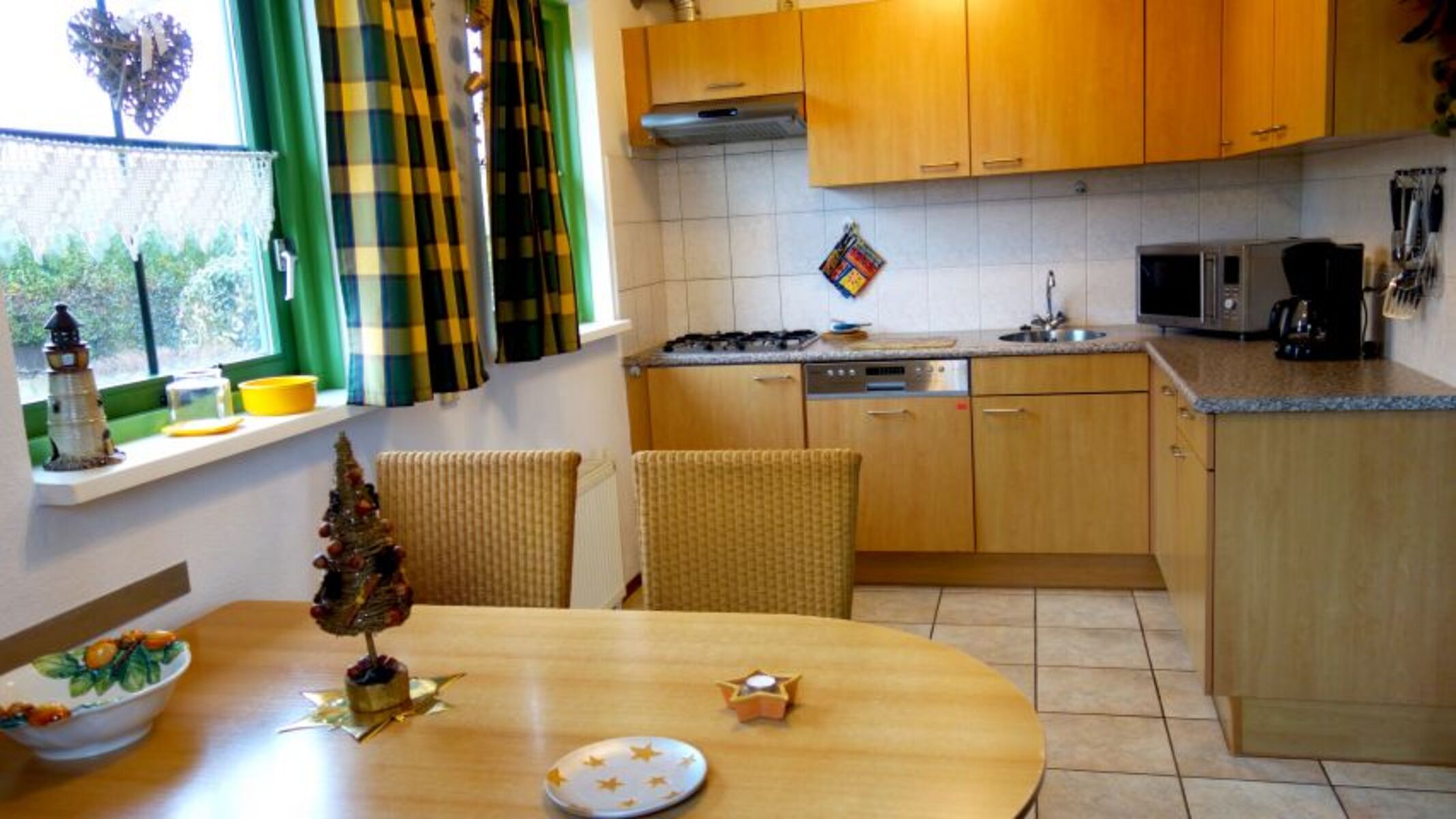 4-Platten Herd, Gasofen / Gasherd, Dunstabzugshaube, Kühlschrank mit Gefrierfach, Mixer, Korkenzieher / Flaschenöffner, Gewürze (Salz, Pfeffer, Zucker), Öl / Essig, Mülltüten, Essplatz in der Küche