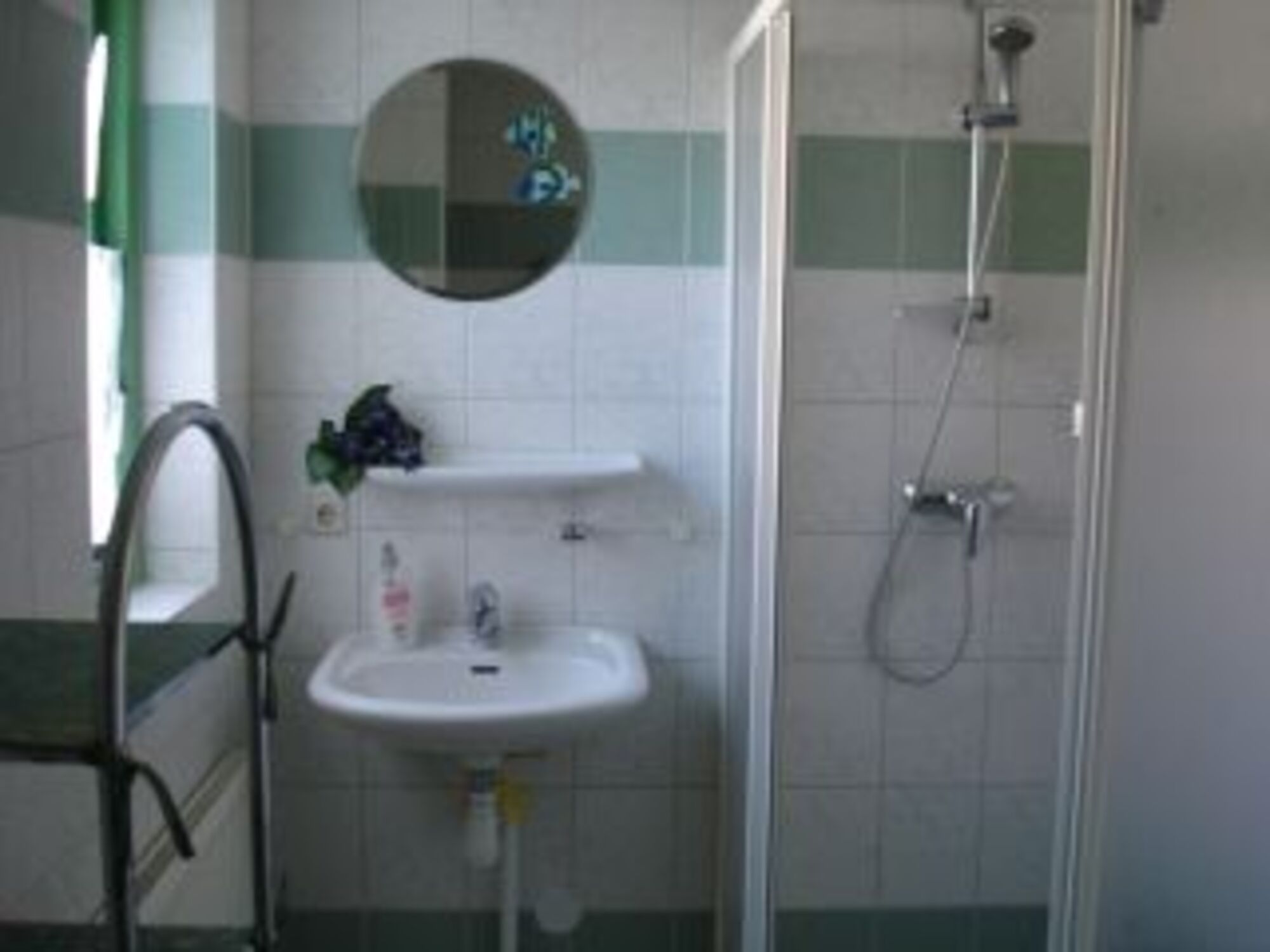 viele Handtuchhaken, Ablagehocker, Duschkabine Waschbecken, Kosmetiktücher, Spiegel, Fenster im Bad