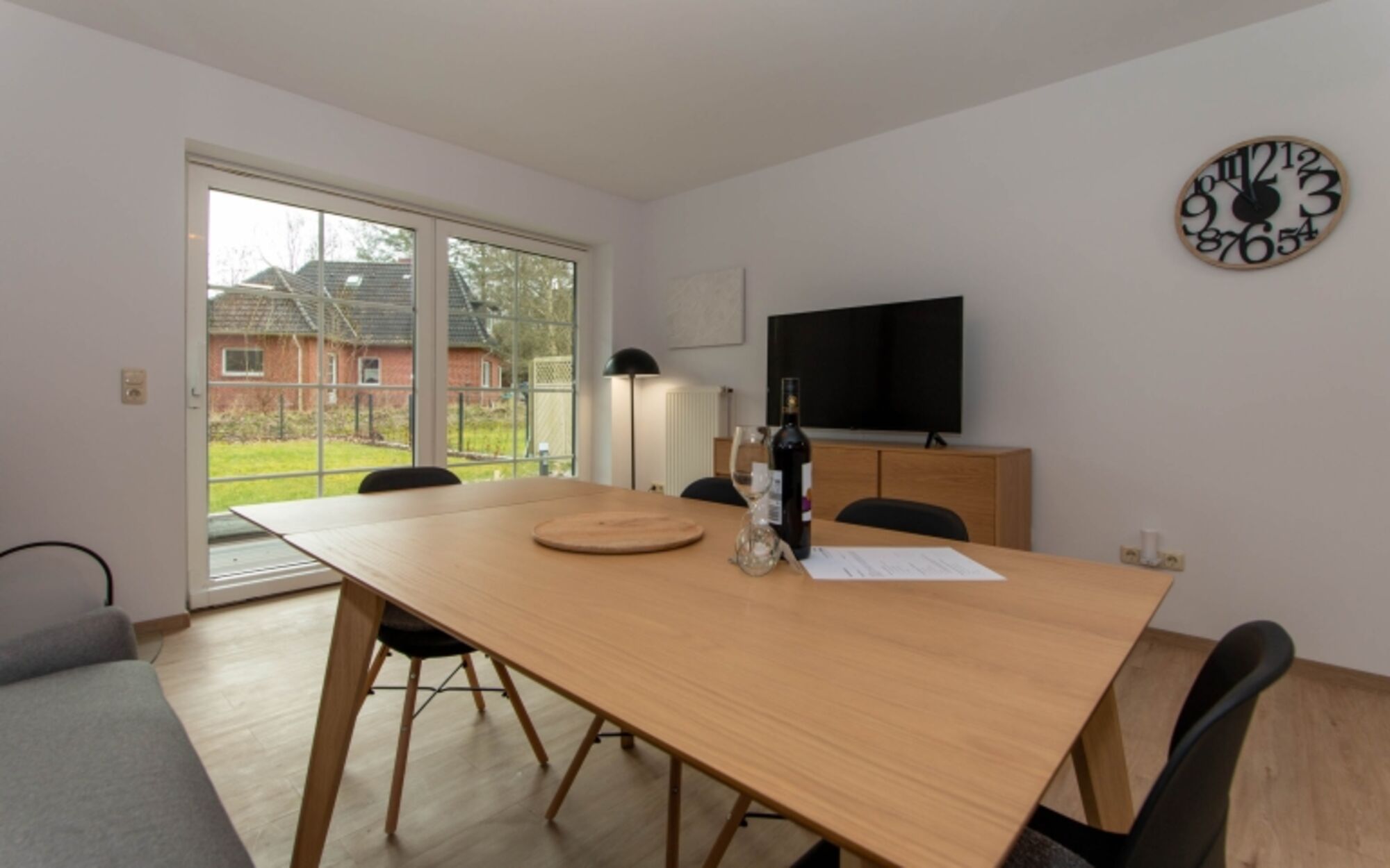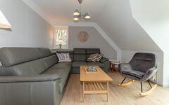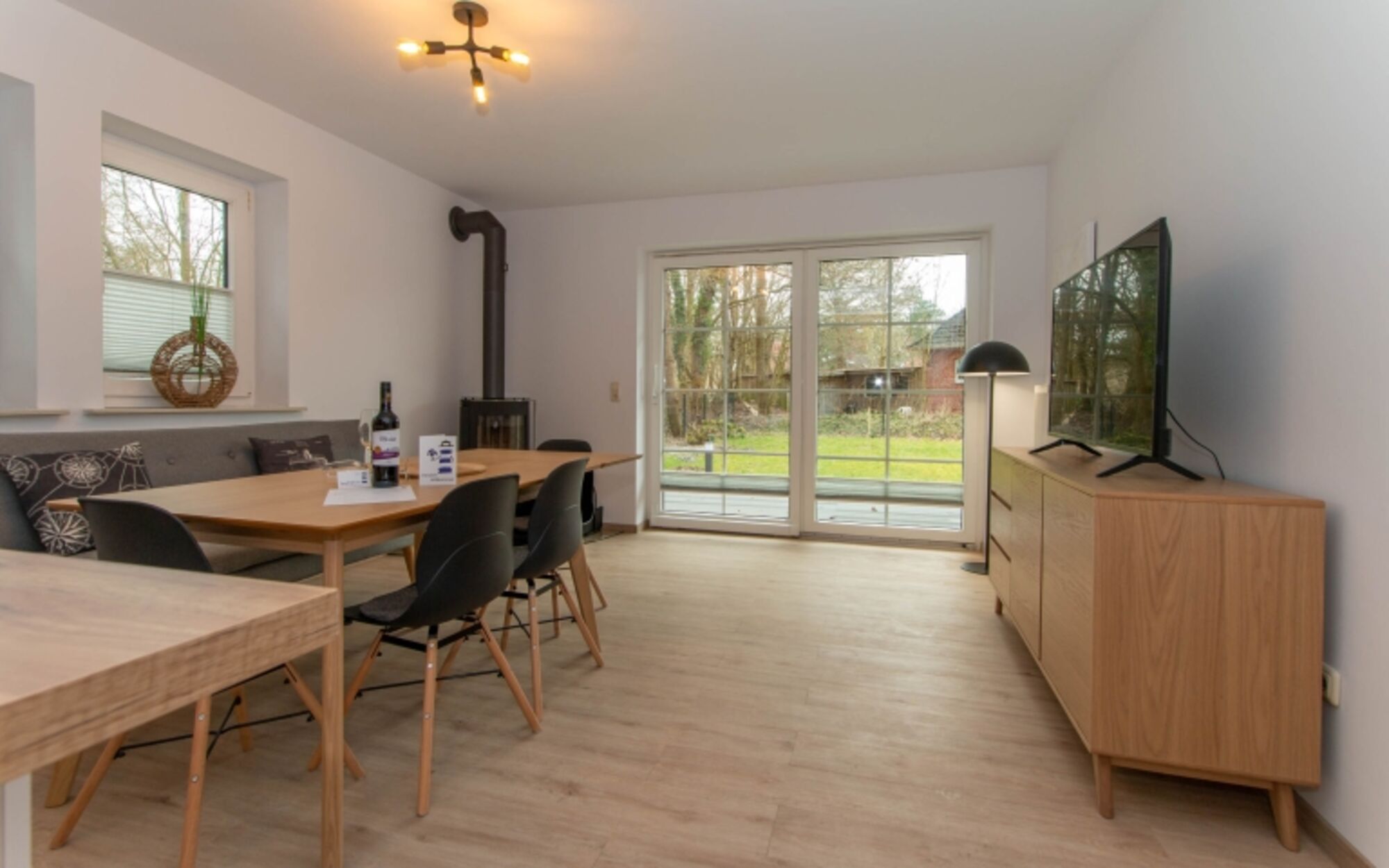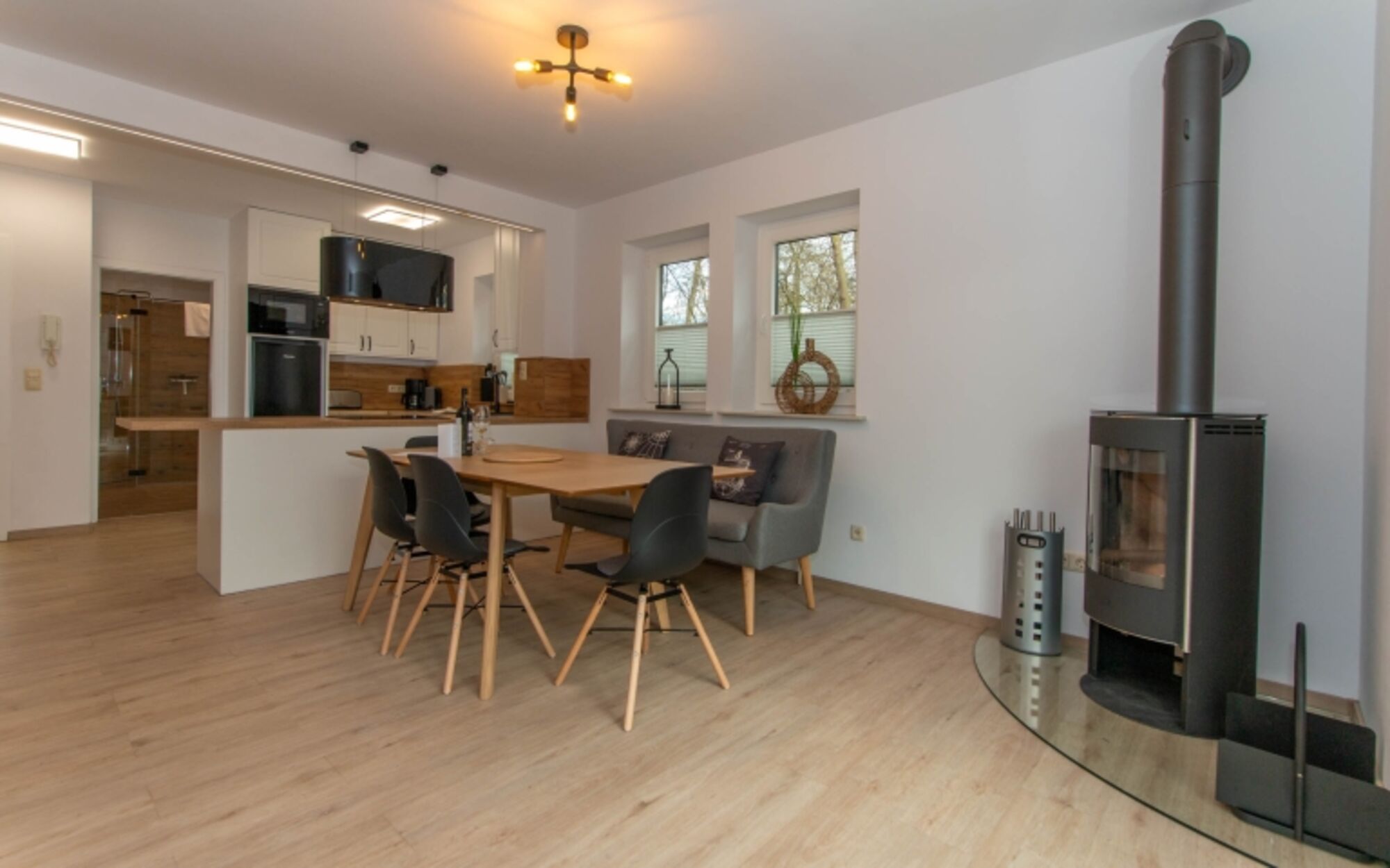 Hier kann der Urlaub für die Zwei- und den Vierbeiner beginnen und zwar direkt in der gemütlichen Wohnküche mit Kaminofen im Erdgeschoss mit direktem Zugang zur möblierten Terrasse. Hier befinden sich auch noch ein Schlafzimmer und ein modernes Duschbad.