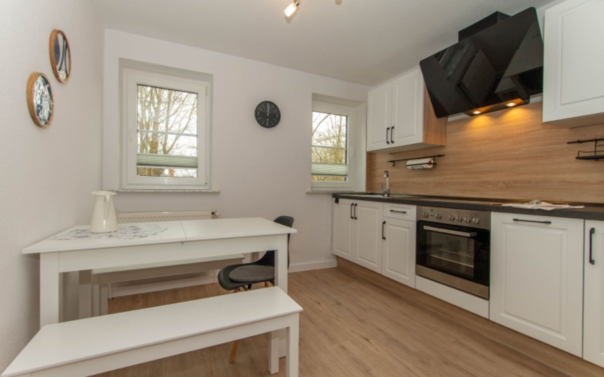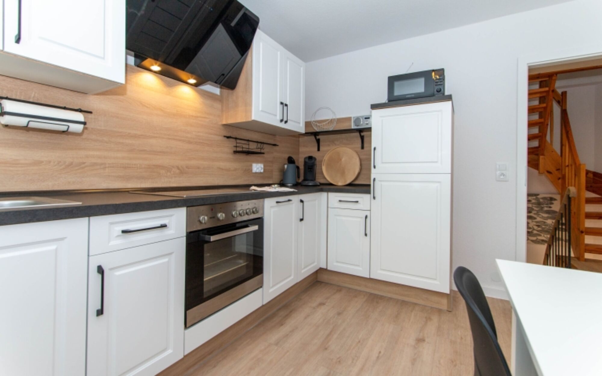 4-Platten Herd, Induktionsherd, Dunstabzugshaube, Gefrierschrank, Korkenzieher / Flaschenöffner, Geschirrhandtücher, Essplatz in der Küche