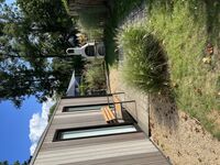 Vom Wohnbereich aus gelangt man direkt in den eingezäunten Garten mit zwei Holzterrassen – perfekt zum Entspannen und ideal für Gäste mit Hund. Ein Parkplatz befindet sich direkt vor dem Haus, sodass man bequem bis vor die Tür fahren kann.