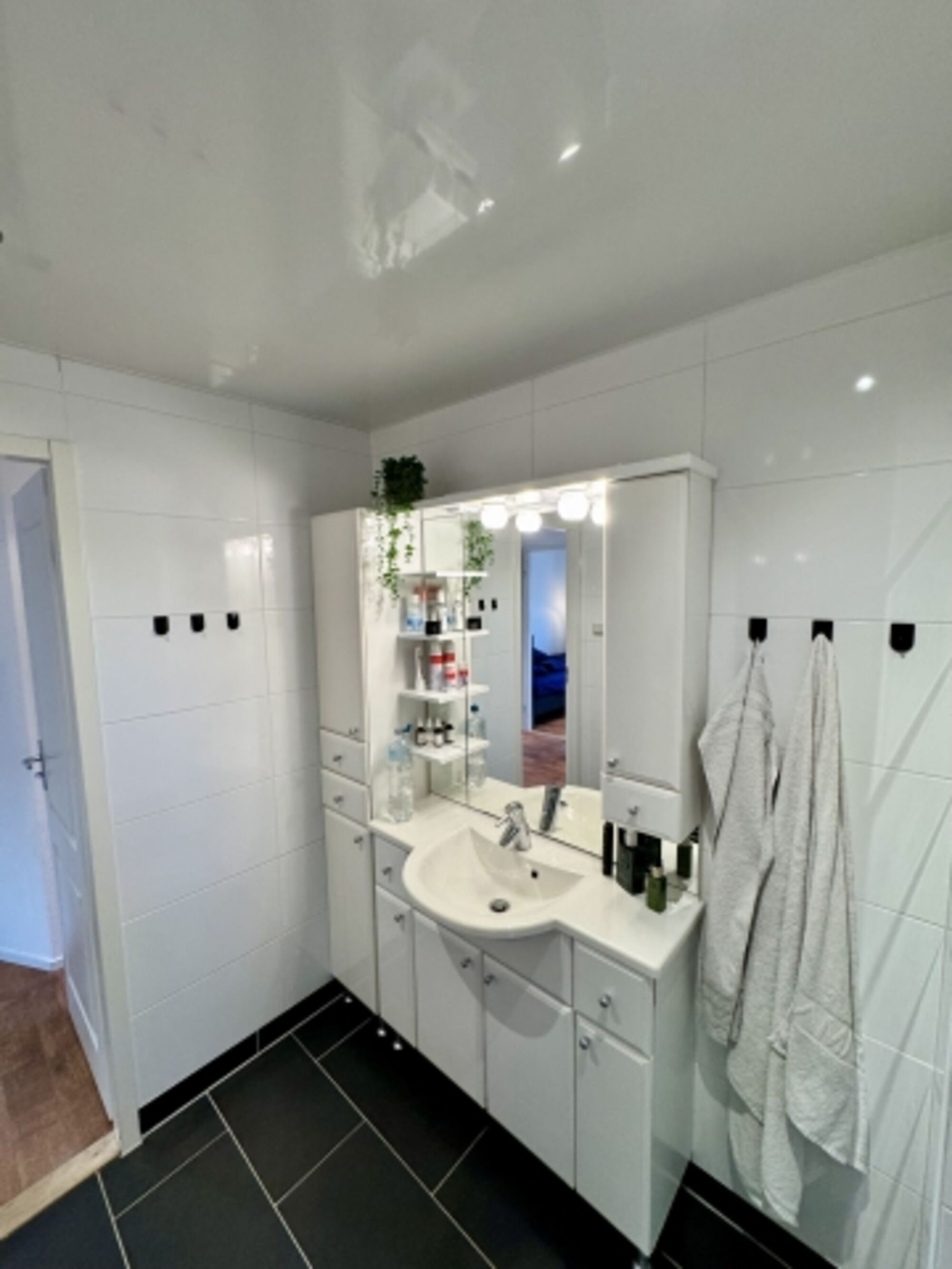 Fenster im Bad, Fliegengitter, Regendusche, Spiegel, Waschbecken
