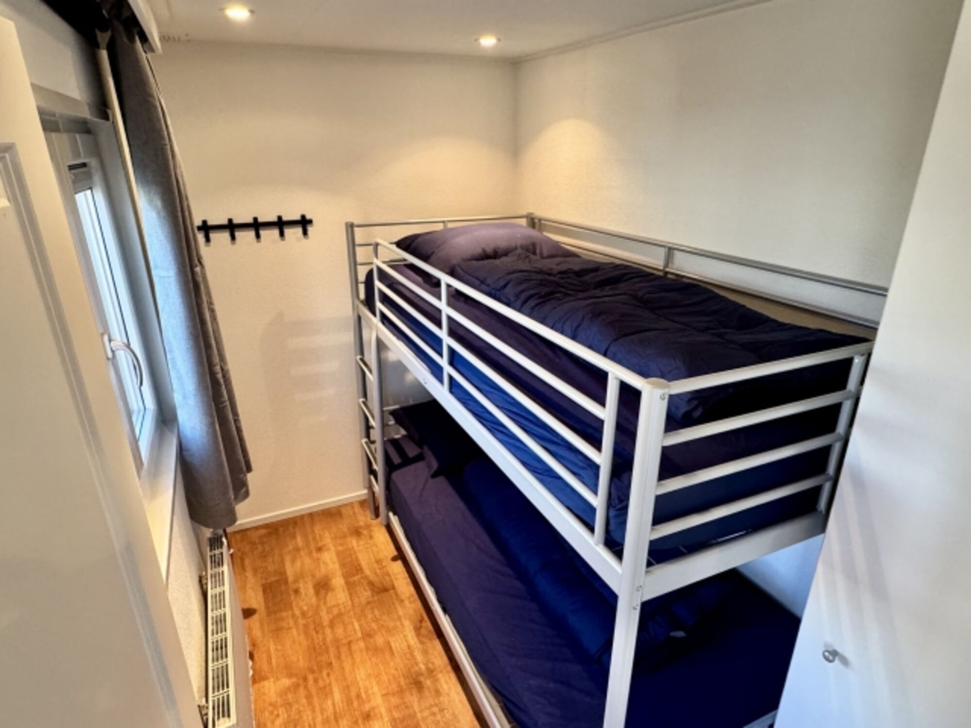 Das Schlafzimmer verfügt über einen Verdunklungs-Rollo und -vorhang. Das Bett ist ein Etagenbett mit je 0,80 x 2,00m