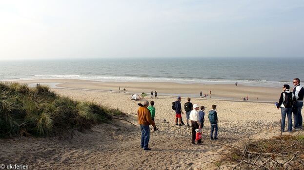 Mitten in der Dünenlandschaft am Horizont ist die Nordsee zu sehen