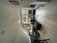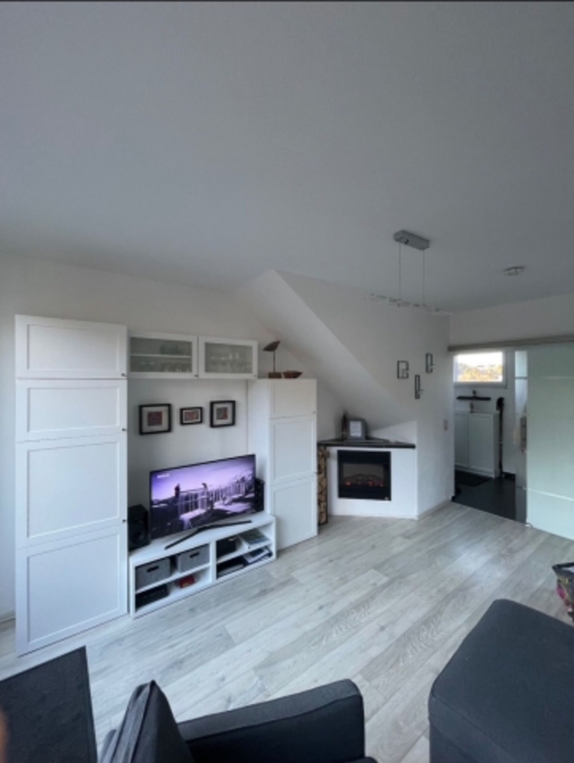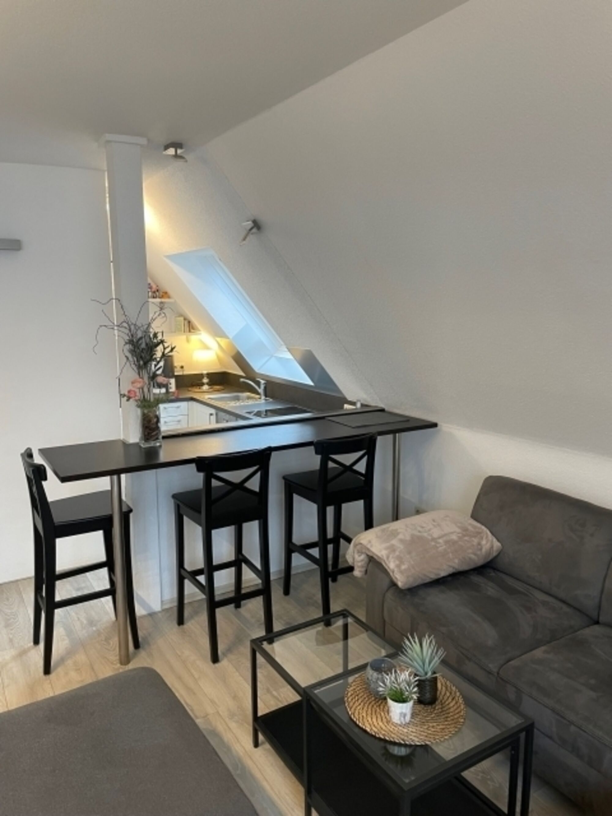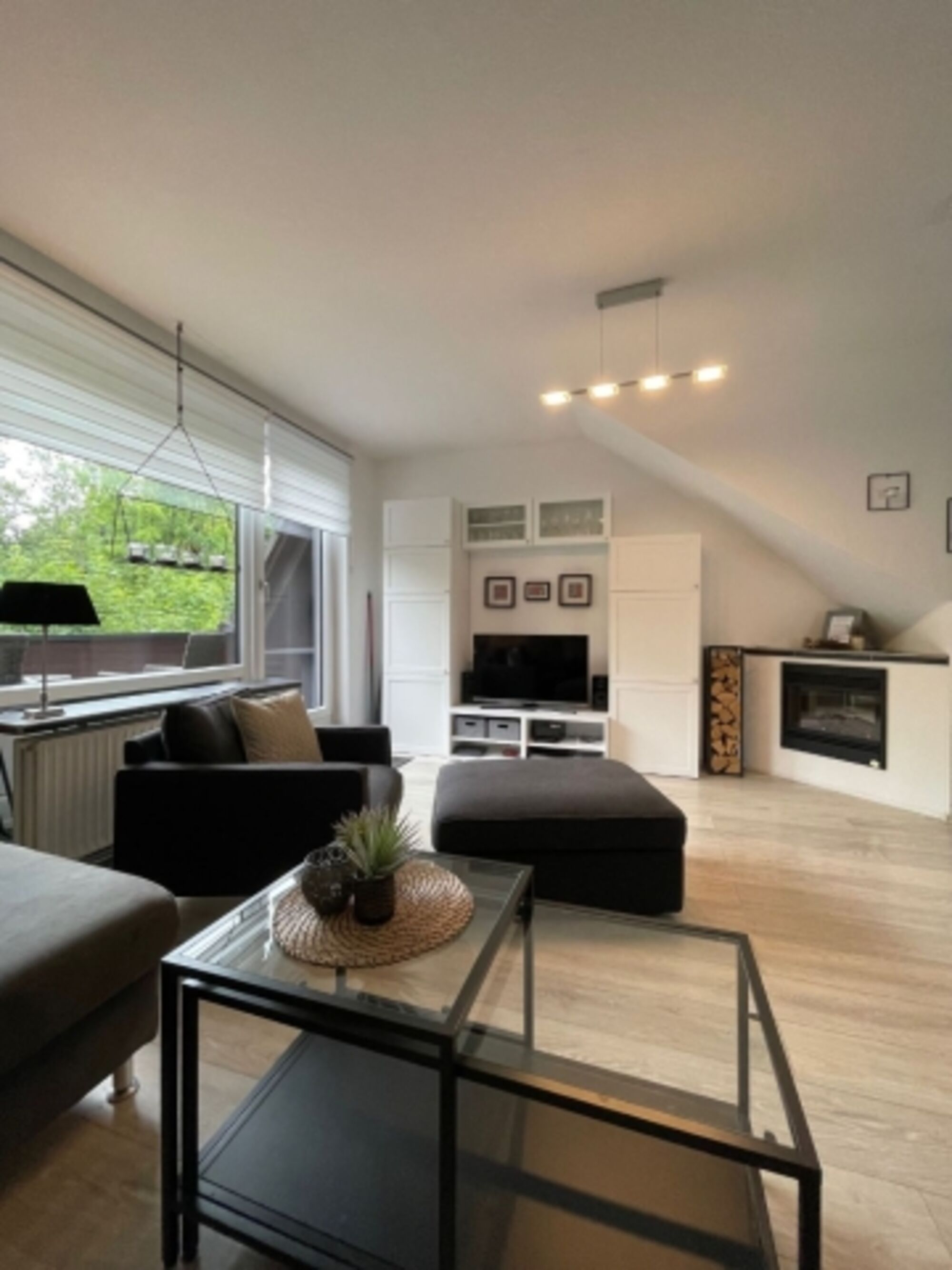 Auf der unteren Etage der Wohnung befindet sich das Wohnzimmer mit einem bequemen Sofa ( 1 Aufbettung für einen 3 Gast möglich), ein Sessel mit Fußhocker, der Elektrokamin, TV und der Zugang zum Sonnenbalkon, die voll ausgestattete Küche mit Esstheke, und das Duschbad.