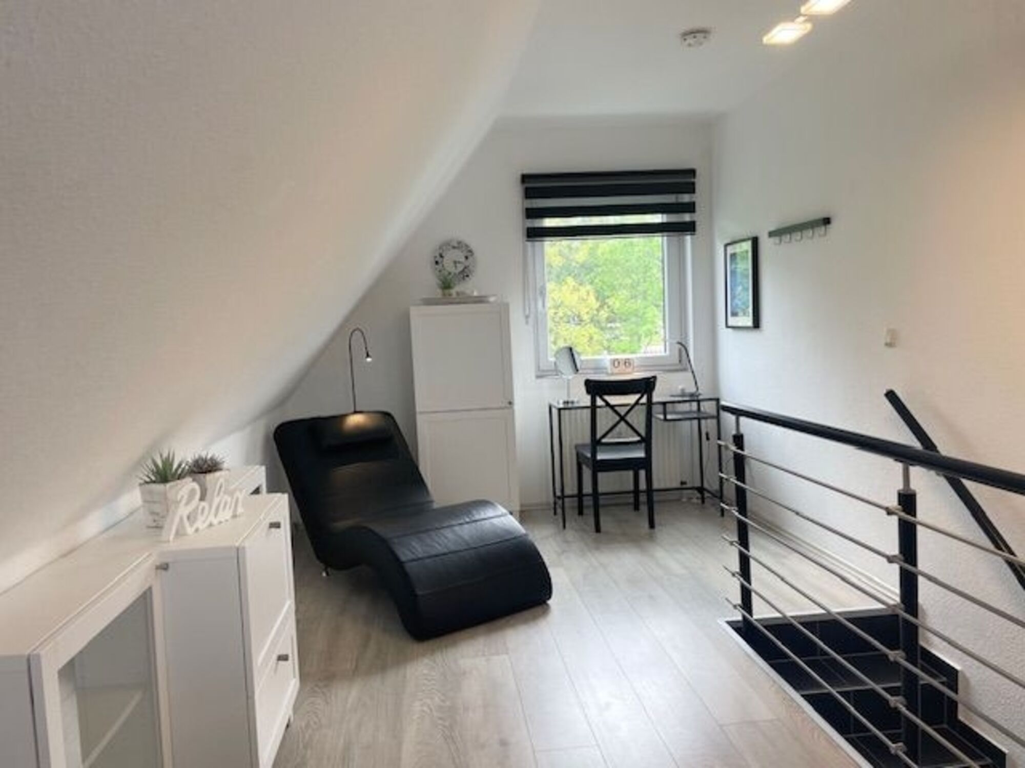 Auf der oberen Ebene befindet sich das Schlafzimmer mit Doppelbett und TV, Leseliege und kleinem Schreib-/Schminktisch .