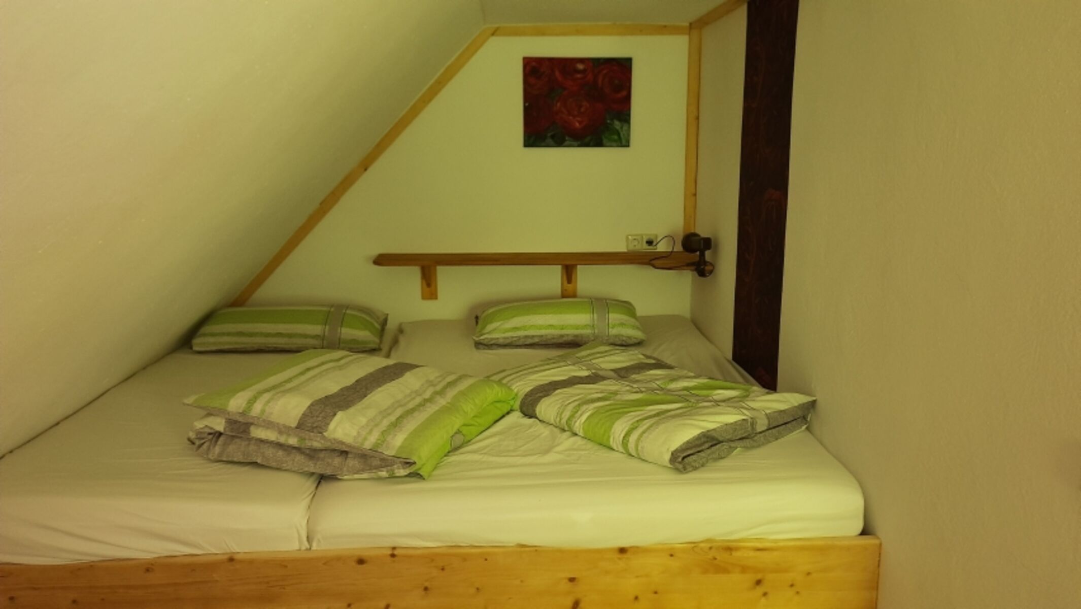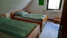 Das Haus von oben nach unten. Im Dachgeschoss befinden sich zwei Schlafzimmer. Eins mit Doppelbett 180 x200 cm, das zweite mit zwei Einzelbetten 90 x 200cm.