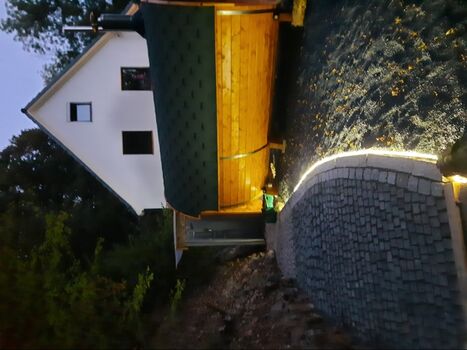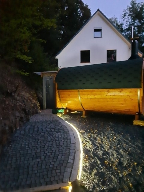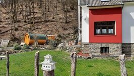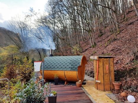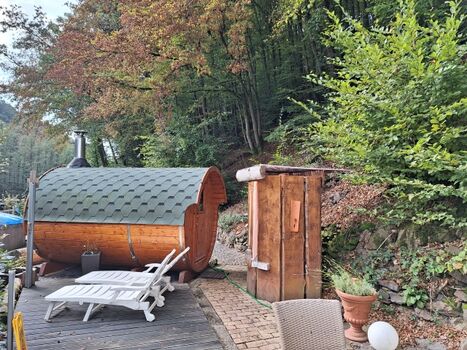 Das Ferienhaus im Rosbachtal bietet viel Komfort und eine tolle Outdoor Wellness Oase. Ein Holzbeheiztes Outdoor Saunafass für knisternde Wohl fühl Wärme, groß genug für 6 Personen