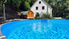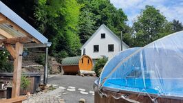 Tolles Wellness Ferienhaus im Windecker Ländchen mit Fass Sauna Holzbeheiztem Hot Tub Whrilpool und Pool. 4 Sz 145m2, Garten eingezäunt