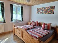 Erstes Obergeschoss, ein Schlafzimmer groß, mit Blick auf den Rosbach und einem 160 x 200cm großen Bett.