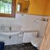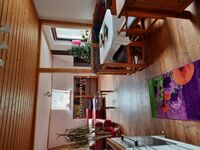 Das tolle Wohnzimmer mit 65Zoll TV, offener Küche und gemütlicher Essgruppe. Sowie das Bad mit Wanne und Waschtisch. Es gibt einen separaten Eingang zum 1 OG. Toilette mit Waschbecken .