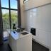 Das Elternschlafzimmer bietet ein 160 x 200 cm Doppelbett mit einem offenen Kleiderschrank und einem bodengleichen großen Fenster mit Fliegenschutz und einem en Suite Bad. Dieses verfügt über eine bodengleiche Regendusche, zwei Waschbecken, eine Handtuchheizung, modernen Armaturen und einem großen Fenster.