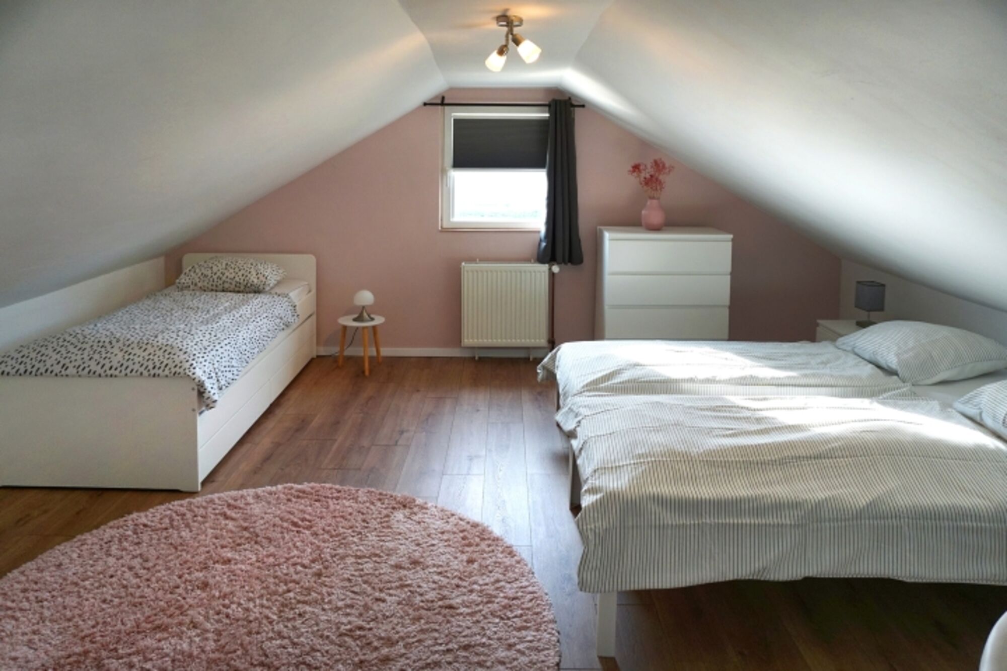 Das Haus verfügt über drei Schlafzimmer. Das erste Schlafzimmer mit einem Doppelbett befindet sich im Erdgeschoss und grenzt an das Wohnzimmer an. Die Treppe im Flur führt ins Obergeschoss. Dort befinden sich die beiden anderen Schlafzimmer und eine separate Toilette. Ein Schlafzimmer verfügt über drei Einzelbetten, das andere über ein Doppelbett. Alle Schlafzimmer sind geräumig, haben ein Fenster und Stauraum für Kleidung.