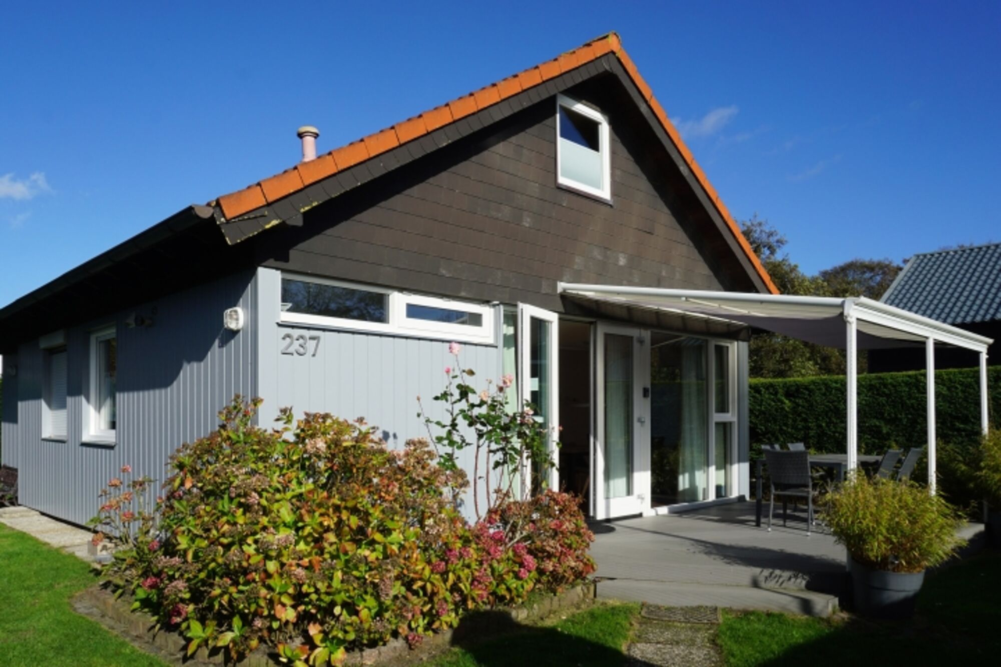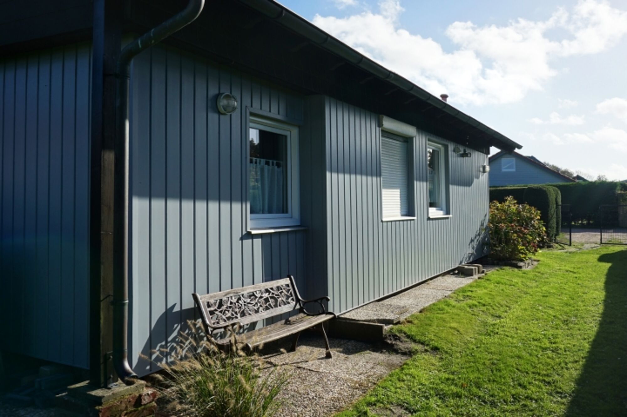 Zusätzlich zu den Einrichtungen im Bungalow verfügt das Haus über einen vollständig umzäunten Garten und eine überdachte Terrasse mit gemütlichen Gartenmöbeln in Südlage.