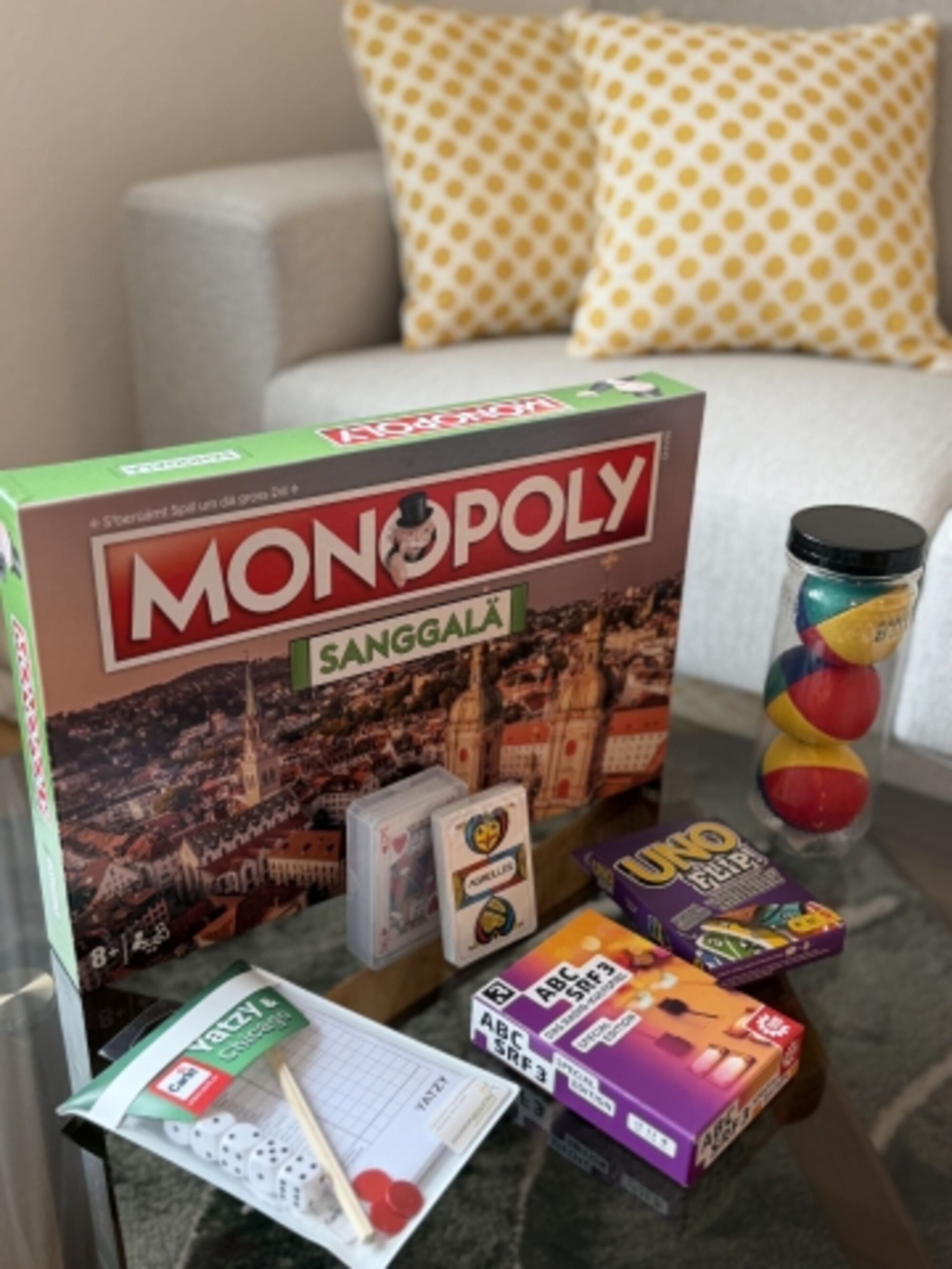 - Gesellschaftsspiele: Monopoly, Jasskarten & Uno