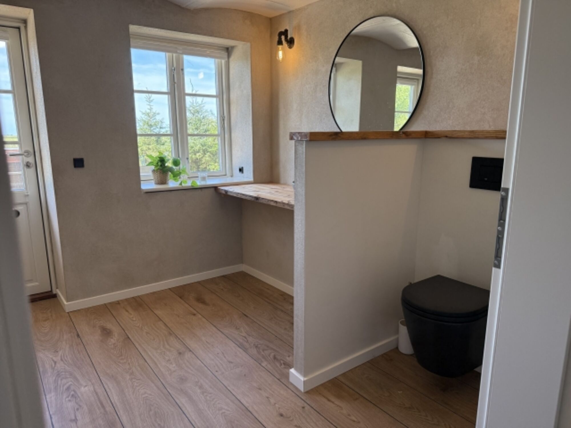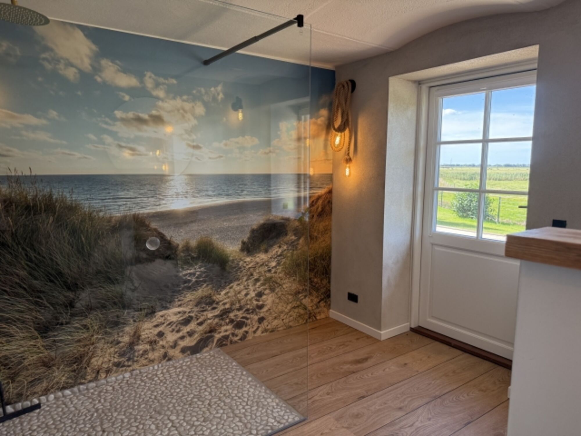 Tür in den Garten Waschbecken, Regendusche, Spiegel, Fenster im Bad