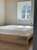 Unbezogene Kissen und Decken Doppelbett 1,80 x 2,00m, Kommode, Leselampe am Bett