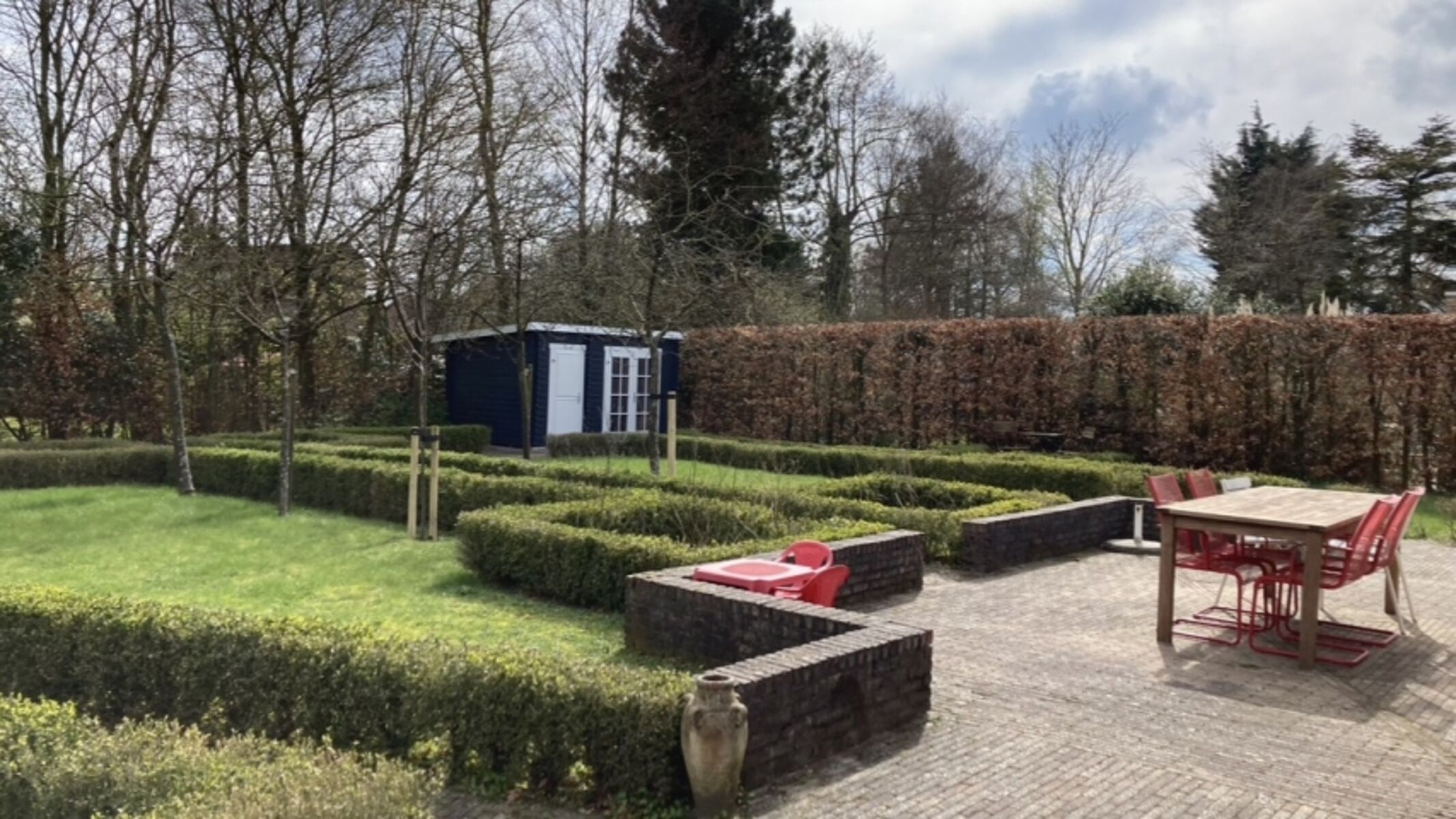 Außen gibt es einen Wasseranschluss mit Gartenschlauch. Das linke Gartenhäuschen im hinteren Teil des Gartens kann zur Unterstellung von z. B. zwei Fahrrädern genutzt werden.