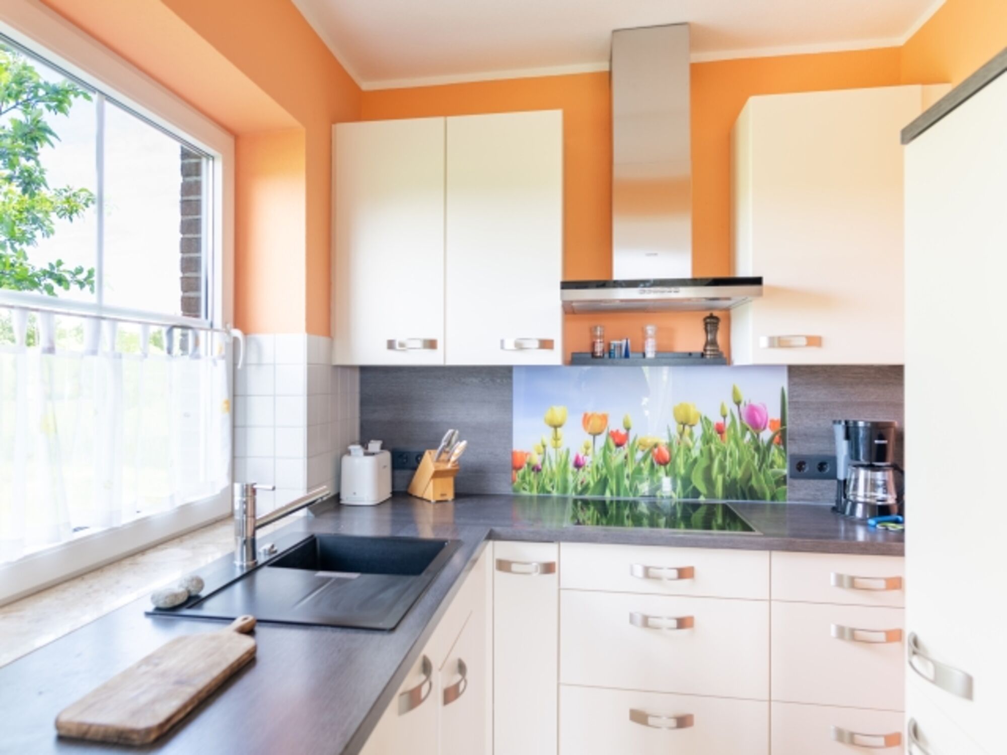 4-Platten Herd, Cerankochfeld, Dunstabzugshaube, Kühlschrank mit Gefrierfach, Korkenzieher / Flaschenöffner, Gewürze (Salz, Pfeffer, Zucker), Geschirrhandtücher, Mülltüten
