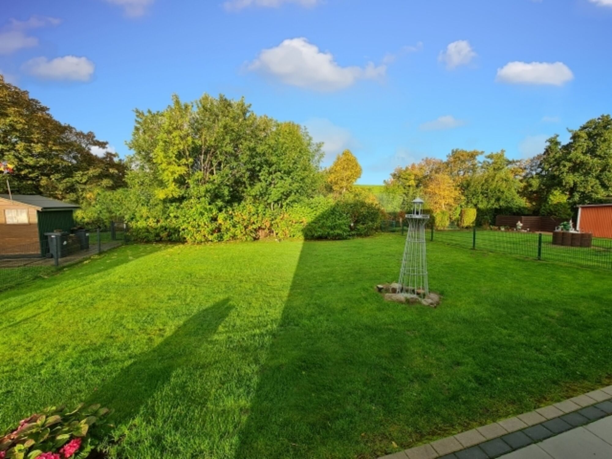 Das Grundstück verfügt über einen vollständig eingezäunten Garten, in dem Sie die Sonne auf der einladenden Terrasse genießen können – ideal für ein Frühstück im Freien bei frischer Seeluft oder gesellige Grillabende mit Blick auf den Deich.