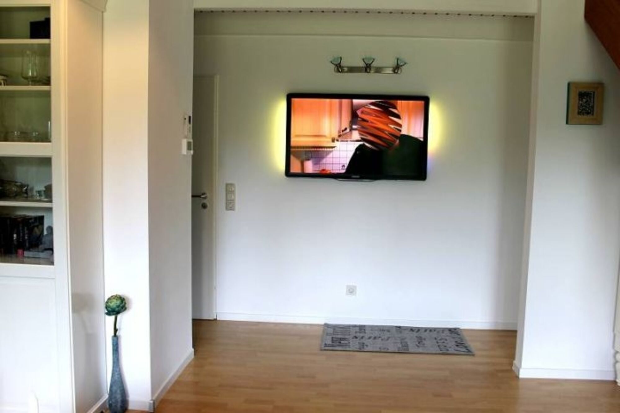 Das gemütliche Wohnzimmer ist mit einer kuscheligen Sofaecke und einem Fernseher ausgestattet. Die große Fensterfront ermöglicht direkten Deichblick und über eine Terrassentür Gartenzugang.
