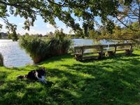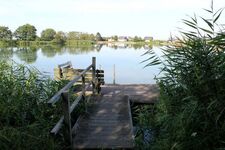 Das Haus ist in erster Reihe direkt am Deich und nur wenige Meter von einem herrlichen Badesee entfernt. Der Garten ist mit einem etwa 80 Zentimeter hohen Zaun abgegrenzt.