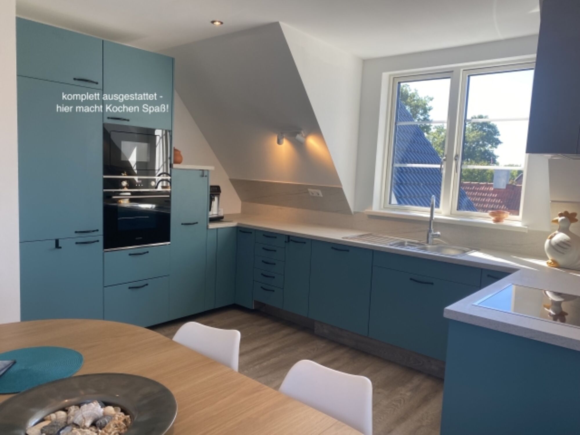 Fußbodenheizung in allen Räumen und eine moderne Einrichtung sorgen für eine entspannte Atmosphäre und die Ausstattung lässt (fast) keine Wünsche offen. Im Wohn-/Esszimmer befindet sich ein Bollerofen und es grenzt an die offene, voll ausgestattete Küche. Kaffeevollautomat oder klassische Kaffeemaschine - hier können Sie wählen. Ein großer ausziehbarer Esstisch bietet viel Platz. Beide Bäder verfügen über ein Fenster und zu Ihrer Unterhaltung gibt es in allen Zimmern Internet-TV und -Radio (Netflix mit eigenem Zugang). Ein Wertsachentresor, kostenloses WLAN (HighSpeedInternet) und eine Spielsammlung runden die tolle Ausstattung ab. Auf dem großen Balkon garantiert der bereit stehende Elektrogrill gemütliche Abende. Ein Fahrradunterstand befindet sich hinter dem Haus unter Ihrem Balkon und 1 kostenloser PKW-Stellplatz finden Sie direkt am Haus.