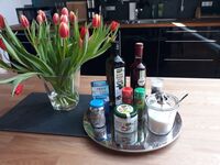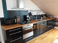 Gasofen / Gasherd, Dunstabzugshaube, Kühlschrank mit Gefrierfach, Eierkocher, Korkenzieher / Flaschenöffner, Gewürze (Salz, Pfeffer, Zucker), Öl / Essig, Geschirrhandtücher, Mülltüten, Essplatz in der Küche, TV in der Küche