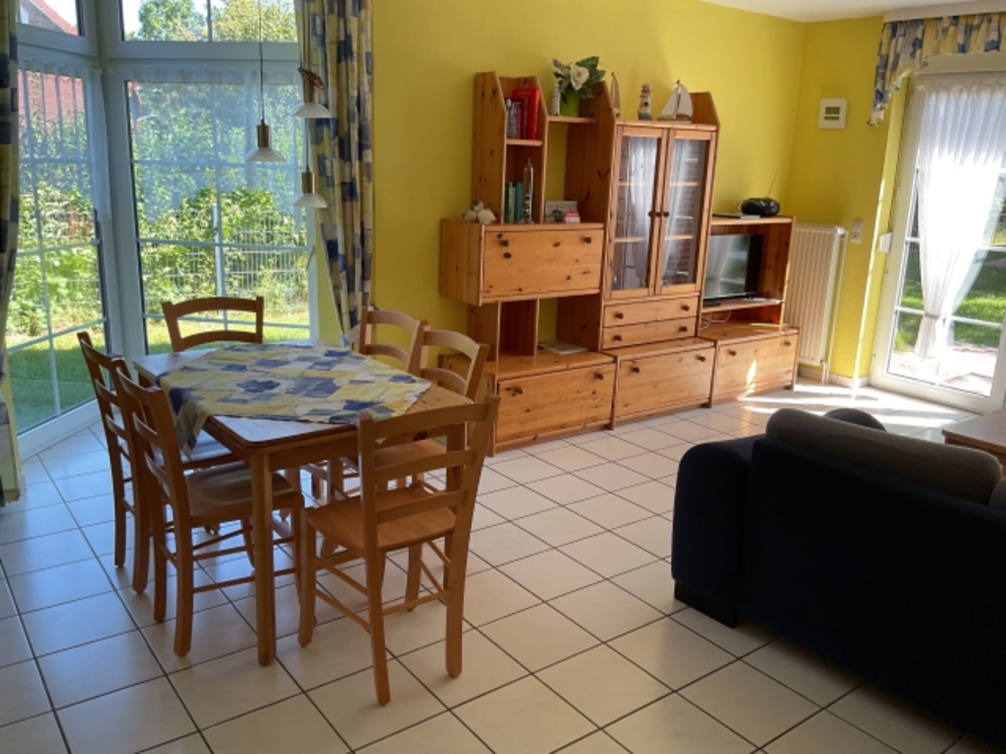 Innen erwartet Sie ein großzügiger offener Wohn- und Essbereich mit gemütlicher Sitzecke, Stereoanlage und Flachbild-TV. Esstisch mit Bestuhlung und offene Küche mit Einbauküche mit Herd und Backofen, Kühlschrank mit Gefrierfach, Microwelle, etc. und natürlich ausreichend Küchengeräte, Töpfe und Geschirr. Von hier aus haben Sie einen direkten Zugang zum eingezäunten Garten mit Terrasse mit Gartenmöbeln.