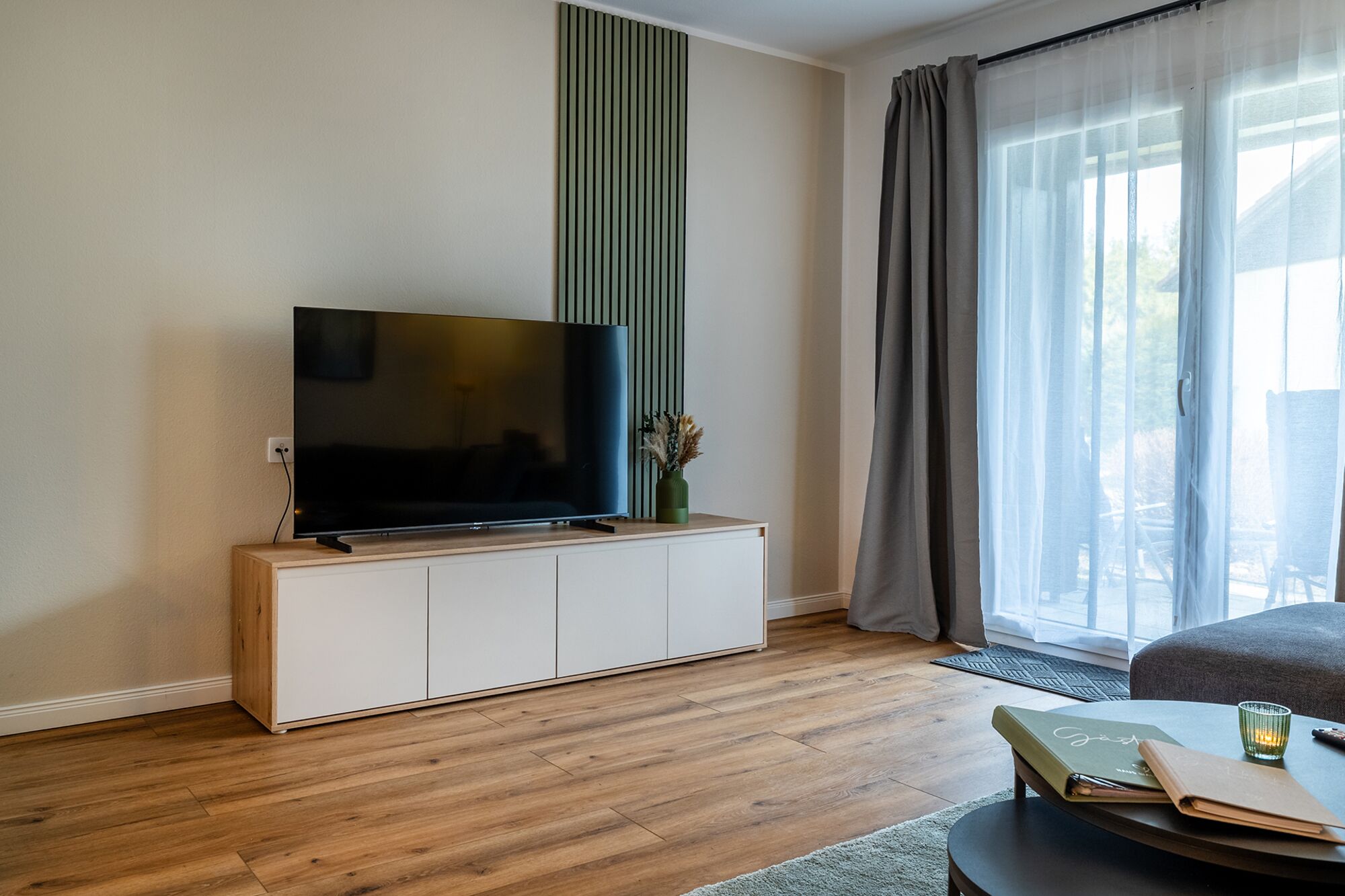 Der offene Wohn- und Essbereich ist das Herzstück des Hauses. Ein gemütliches Sofa, ein Essplatz für gemeinsame Mahlzeiten und ein stilvoller Elektrokamin sorgen für eine warme, behagliche Atmosphäre – perfekt für entspannte Abende nach langen Spaziergängen. Selbstverständlich steht euch kostenloses WLAN zur Verfügung.