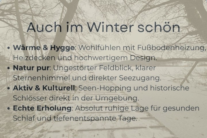 3. Naturerlebnis & Aktivität direkt vor der Tür: In der Nebensaison gehört dir die Natur fast allein. Ein gemähter Pfad führt dich über unser 6.000 qm großes Grundstück direkt zum Seeufer – ideal für stille Momente oder Yoga am Wasser. Aktivurlauber schätzen den direkten Einstieg in den Mecklenburger Seen-Radweg und den Pilgerweg. Auch dein Hund ist bei uns herzlich willkommen und wird die weiten Wanderwege direkt vor der Haustür lieben.