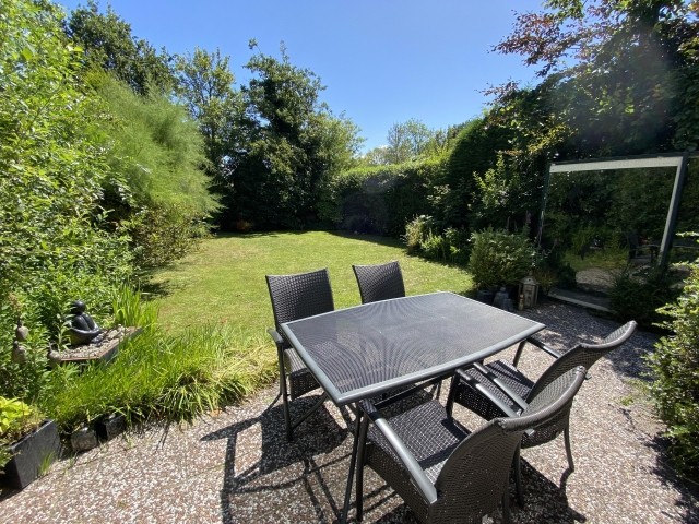 Der Garten ist offen, bietet jedoch viel Privatsphäre durch Sträucher und Bäume. Auf Anfrage kann ein mobiler Zaun geliefert werden.