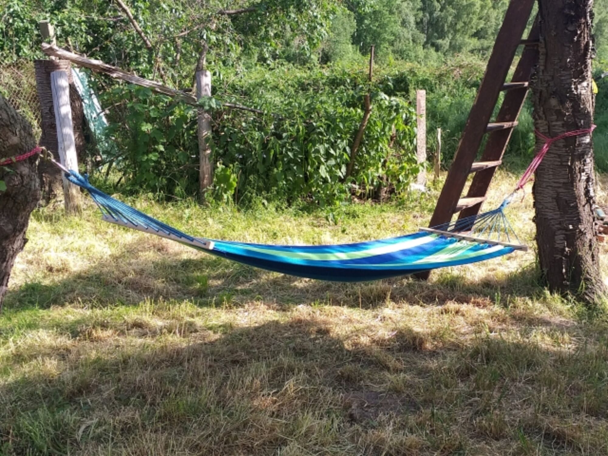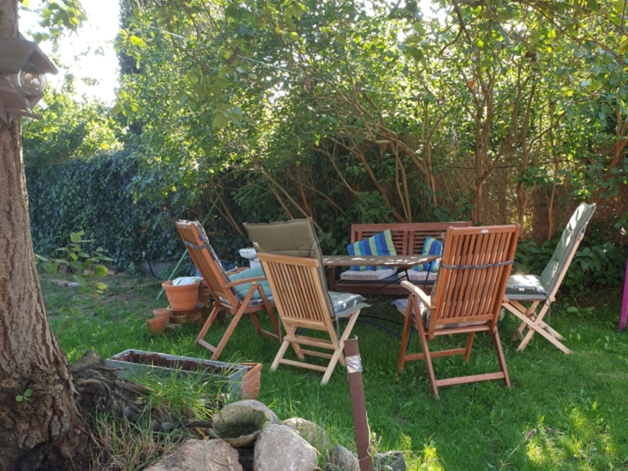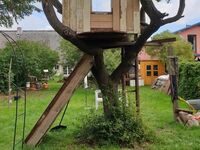 Abrunden kannst du dein Erleben noch in dem großen Garten, der dir mit seinen Obstbäumen, Beerensträuchern, grünen Oasen und den beruhigenden Aussichten zur alleinigen Nutzung zur Verfügung steht. Deine pelzigen Begleiter können hier unbeschwert herumtoben und sich wohlfühlen. Der Garten ist komplett eingezäunt (mindestens 1 Meter Höhe), so dass sich Kind und Hund nicht verlaufen können. Vor dem Haus ist auch noch ein Spielplatz mit Schaukeln, Rutsche und Tischtennisplatte. In einem alten Pflaumenbaum im Garten ist ein Baumhaus integriert, das vielen Kindern Spaß macht.