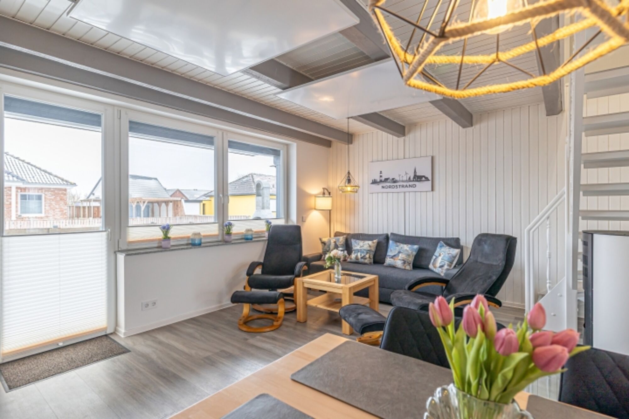 Die Halbinsel Nordstrand liegt direkt im UNESCO-Welterbe Wattenmeer, ca. 20 km vor Husum, und ist über den immergrünen Damm mit dem Festland verbunden. Vom Ferienhaus sind Sie schnell über den Deich spaziert, jetzt nur noch ein paar Stufen hinunter und Sie stehen mitten im Watt. Bis zum Zentrum von Norderhafen mit einigen Fischbistros, Restaurants, dem Schwimmbad und einem Spielplatz sind es nur 350 m. Wer noch etwas weiter geht, landet automatisch am Badestrand Holmer Siel, wo in Teilen auch Hunde mitgeführt werden dürfen.