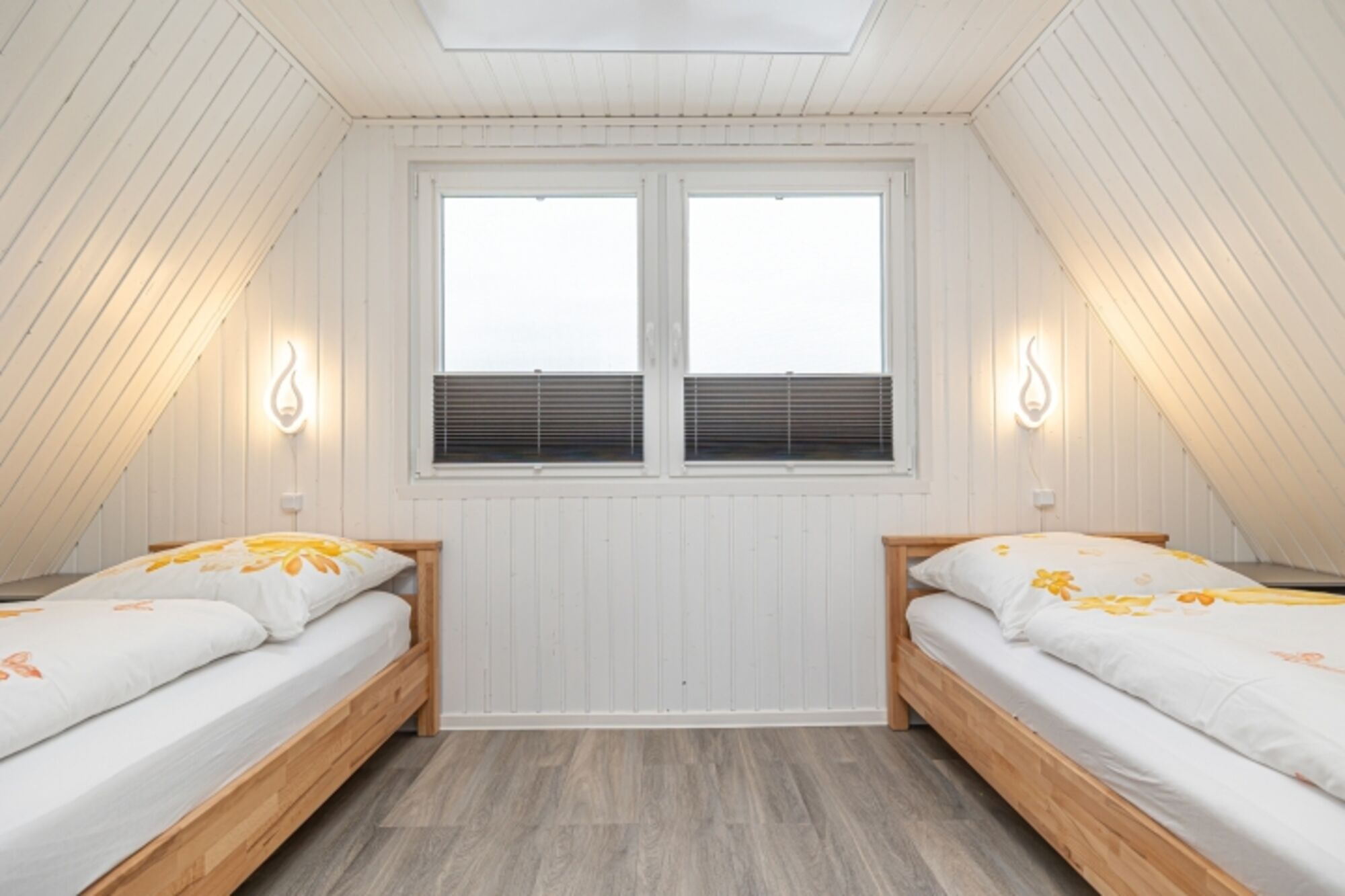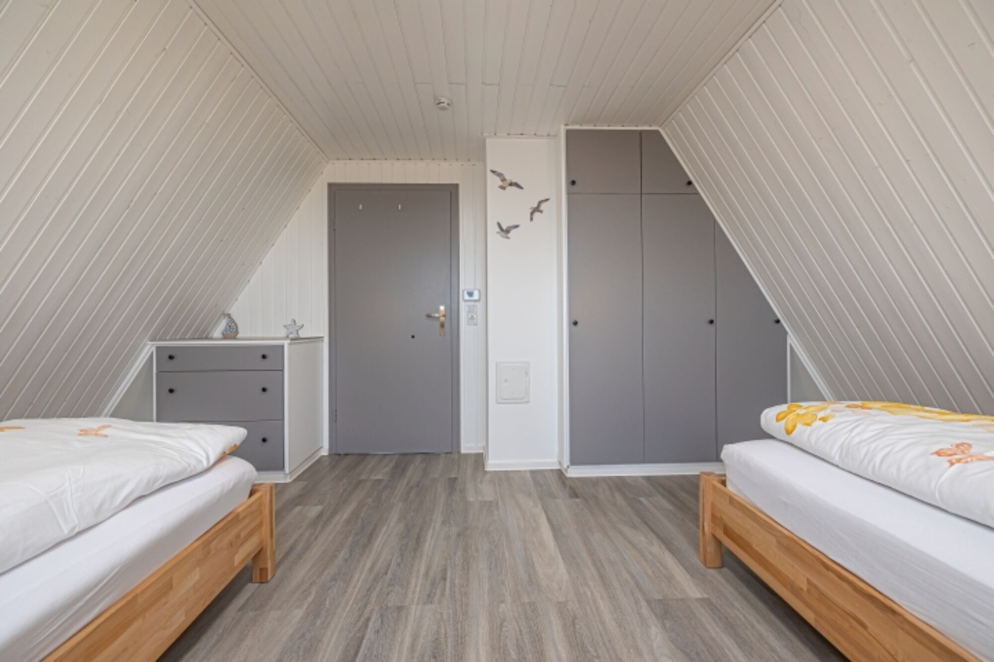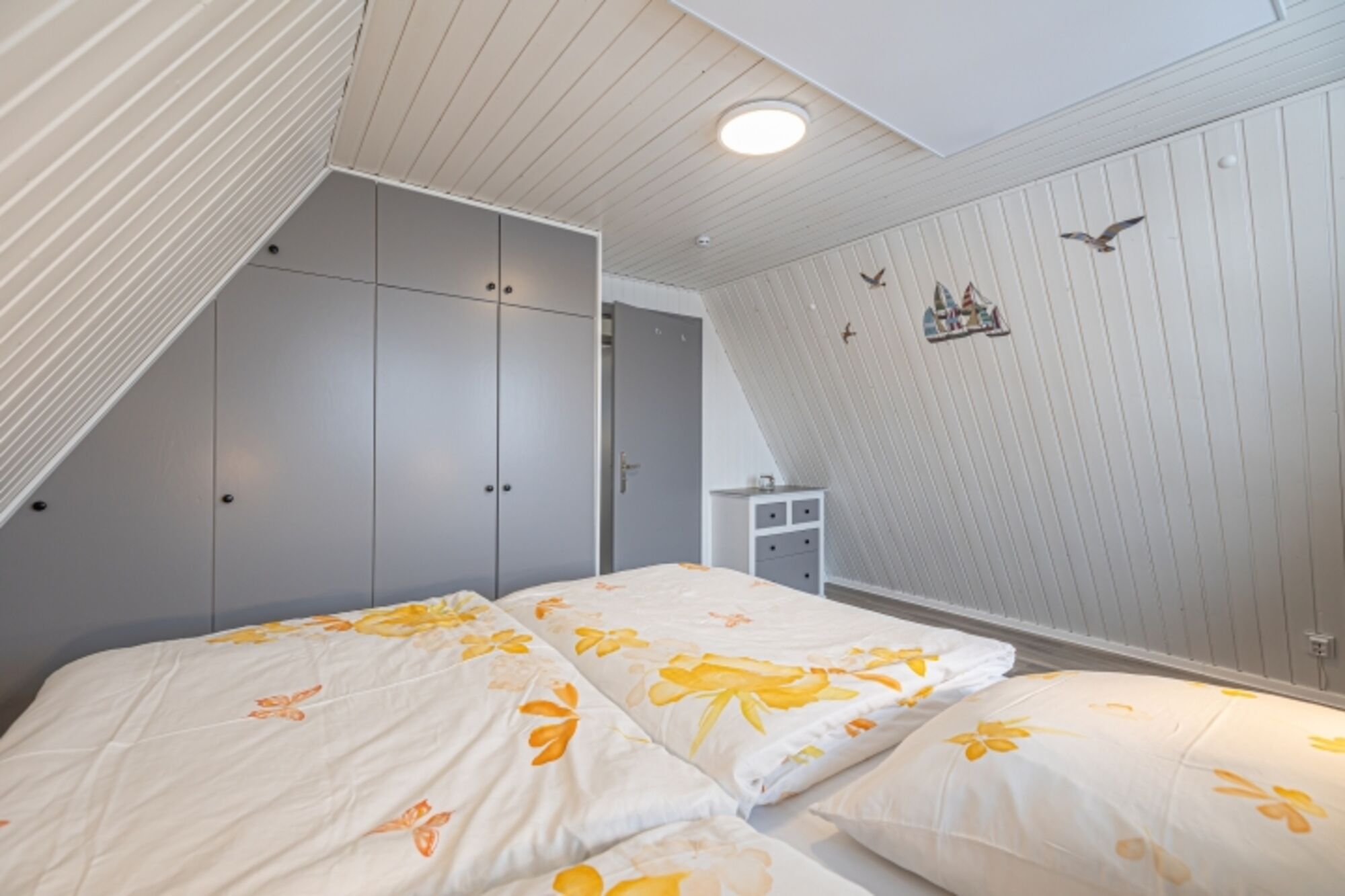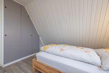 Gemütlich schräg geht es im Obergeschoss weiter. Die Eigentümer haben die Dachflächen optimal genutzt und die beiden Schlafzimmer mit maßgefertigten Einbauschränken bestückt. So haben Sie genügend Stauraum für Ihre Urlaubsutensilien. Das erste lockt übrigens mit einem Doppelbett (180 x 200 cm) und Balkon, das zweite mit zwei Einzelbetten (90 x 200 cm) und einem zauberhaften Ausblick auf den Deich hinterm Haus.