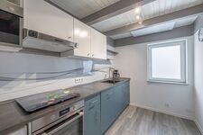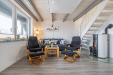 Äußerst komfortabel präsentiert sich die Küche: Dort gibt es nicht nur die üblichen Geräte wie Geschirrspüler, Herd und Mikrowelle, sondern auch eine Waschmaschine und einen Side-by-Side-Kühlschrank mit extra viel Platz. Den hat der Urlaubstrupp auch im Wohn-Esszimmer, dem Herzstück des Hauses: Dort können Sie in zwei Relaxsesseln samt Hocker entspannen oder auf dem Sofa die Beine hochlegen. Und während Sie sich erholen und die Kids auf dem Flat-TV ihre Lieblingsserie schauen, macht der Pelletofen seine Arbeit und verströmt seine wohltuende Wärme. Nachschub zum Befeuern hält der Vermieter für Sie bereit.