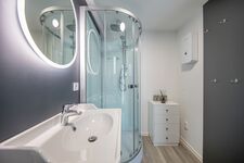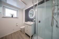 Schlau gelöst für Familien: Damit Sie die wattverschmierten Buddelprofis nach einem langen Strandtag nicht erst durchs Haus manövrieren müssen, befindet sich gleich neben dem Eingangsbereich das moderne Duschbad.