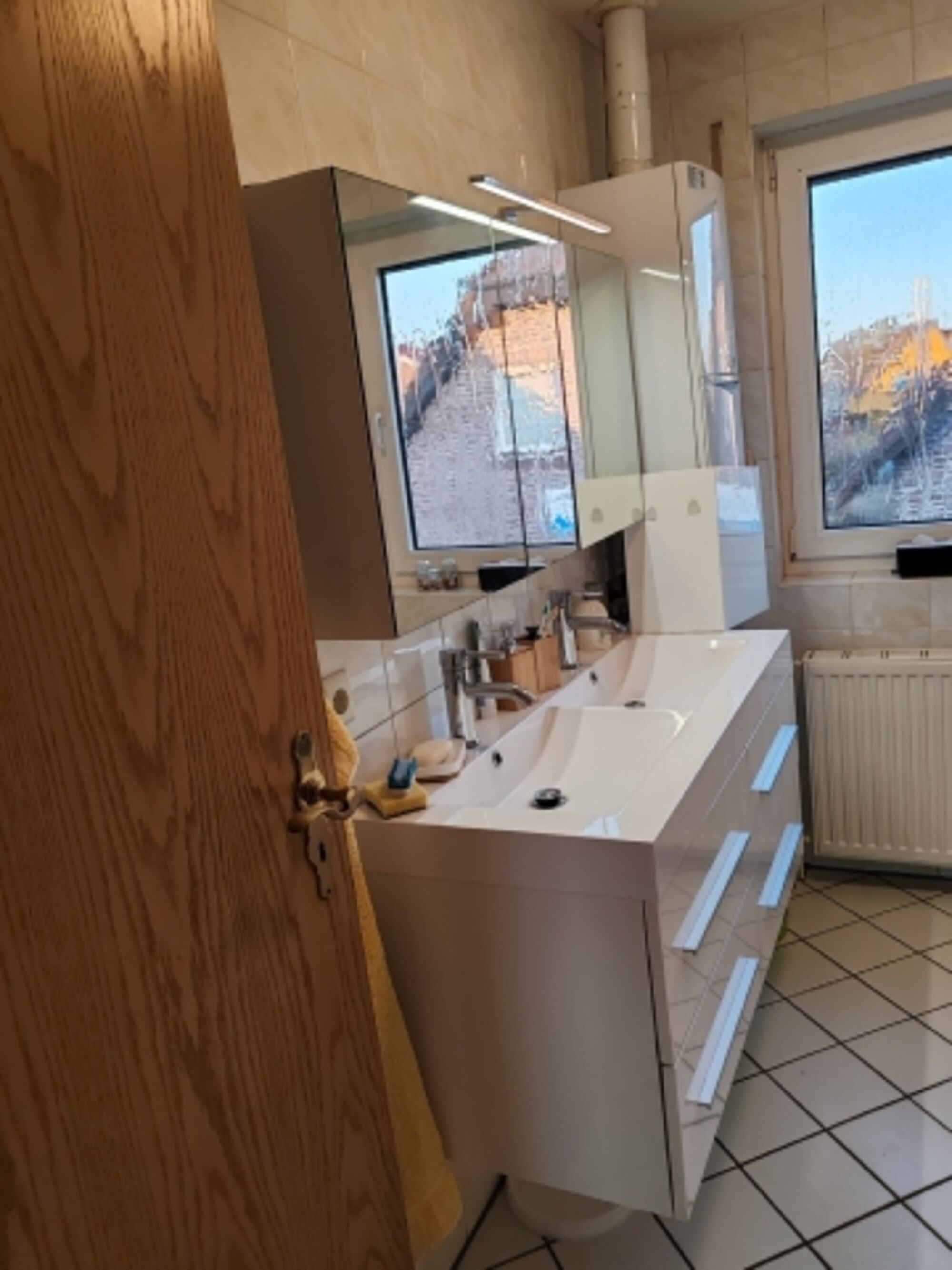 Badewannensitz Doppelwaschbecken, Spiegel, Fenster im Bad