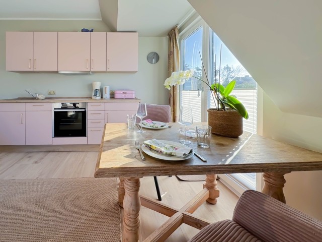 Die offene Küche ist hochwertig ausgestattet und bietet alles, was Sie für die Zubereitung Ihrer Mahlzeiten benötigen. Moderne Elektrogeräte, ausreichend Arbeitsfläche sowie eine ansprechende Ausstattung machen das Kochen auch im Urlaub zu einem Vergnügen. Der angrenzende Essbereich bietet Platz für gemeinsame Mahlzeiten und gesellige Abende.