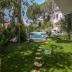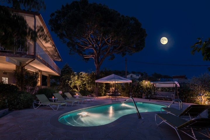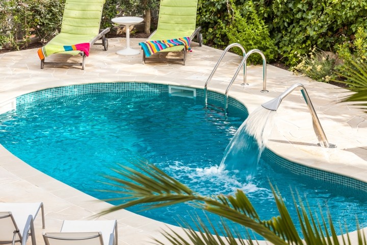Relaxen Sie am privaten Pool (7,5x4m, die Salzwasser-Elektrolyse ist hautschonend, Sie können den Pool nachts beleuchten und es gibt einen Poolwasserfall), umgeben von Sonnenliegen, einer Hollywoodschaukel und einer Pergola mit Esstisch und Stühlen.