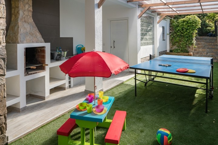 Eine Hollywoodschaukel befindet sich am Pool, es gibt auch eine große Tischtennisplatte und -schläger, Kinderspielzeug, Strandsachen, Bücher, Gesellschaftsspiele uvm.