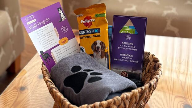 Willkommenspräsent für Ihren Vierbeiner mit Kotbeutel & Leckerchen. Hundehandtuch & Hundebette und Futterstation.