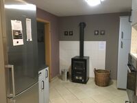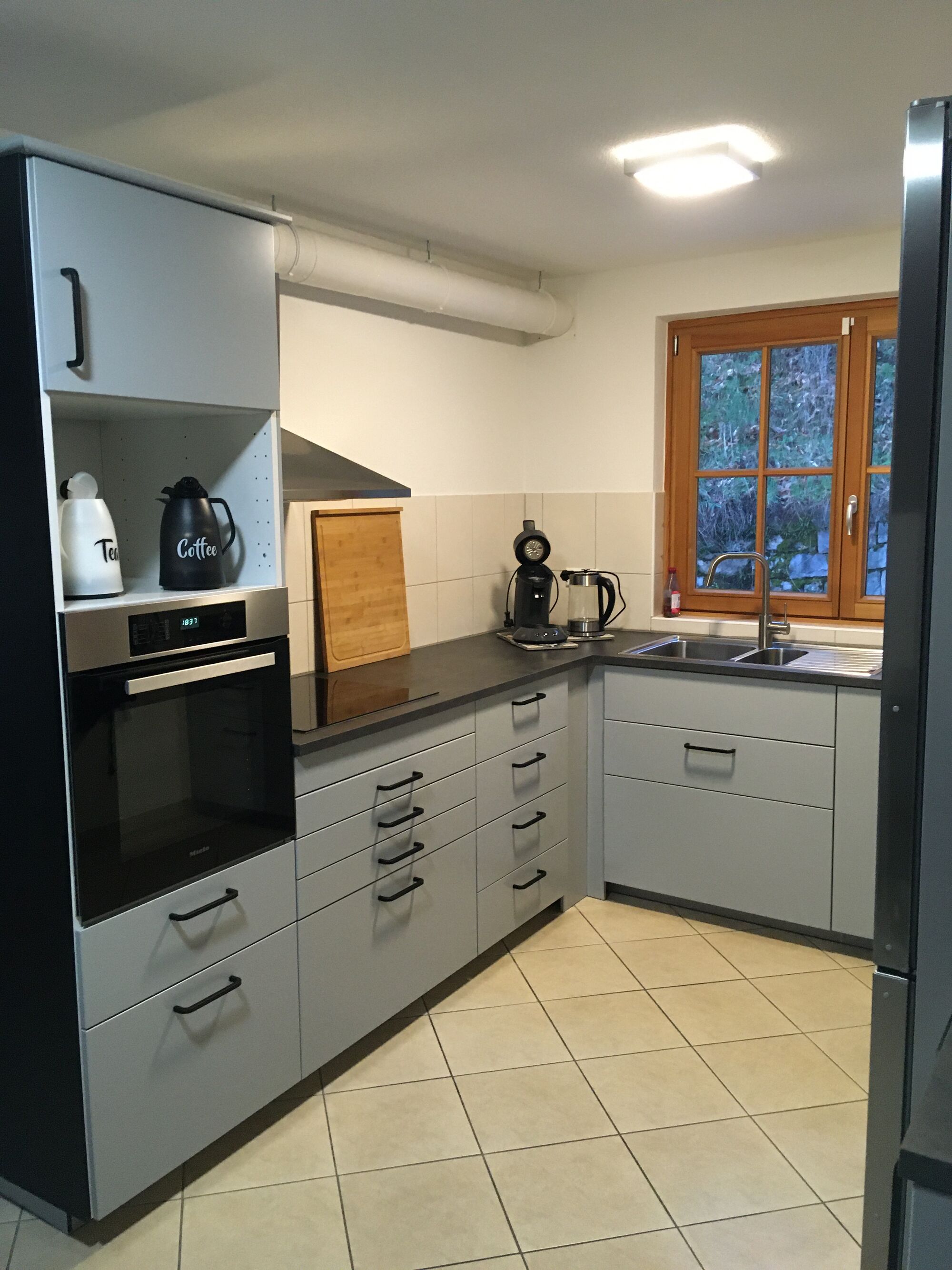 Cerankochfeld, Dunstabzugshaube, Kühlschrank mit Gefrierfach, Senseo-Kaffeeautomat, Eierkocher, Korkenzieher / Flaschenöffner, Gewürze (Salz, Pfeffer, Zucker), Geschirrhandtücher, Mülltüten