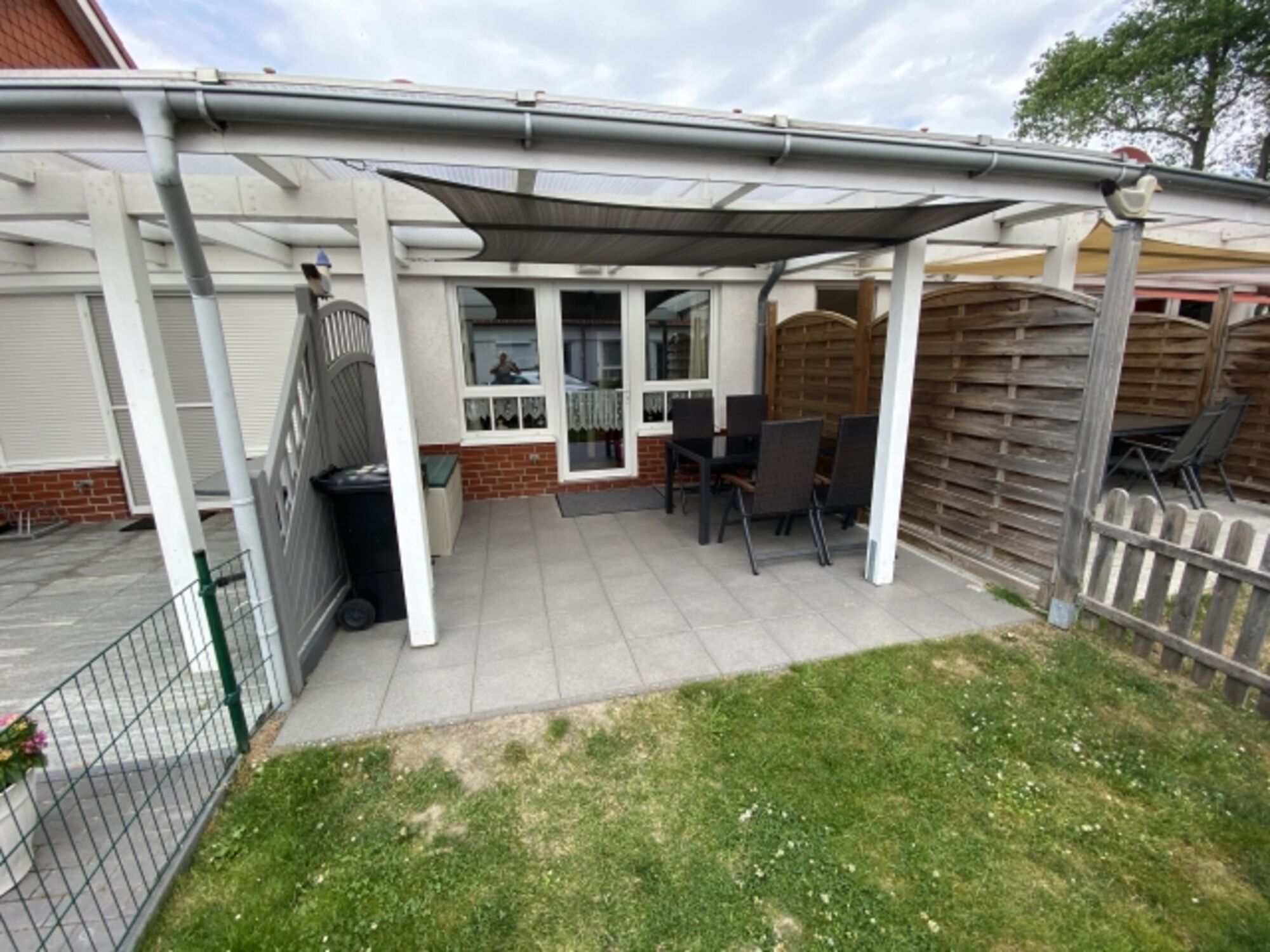 Im Außenbereich befindet sich eine gemütliche, überdachte Terrasse ausgestattet mit Teakholzmöbeln und einem kleinen Grill. Hier darf auch gerne geraucht werden (im Haus bitte nicht!).