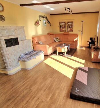 TV, TV-Sat, SMART-TV, TV-Flachbildschirm, HDTV Flachbildschirm, DVD-Player, DVD bzw. Blu-Ray-Filme, CD-Player, CD´s, Bücher, Kaminofen, Kachelofen, Eckcouch, Fliegengitter