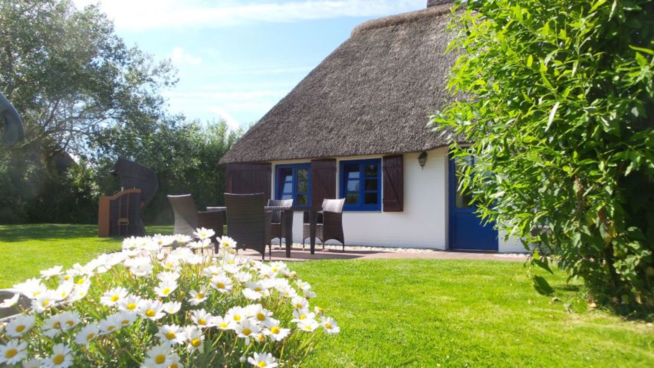 Unsere Fischerkate bietet 2 Schlafzimmer für max. 4 Personen, eine gemütliche Wohnstube mit Ledergarnitur und Kaminofen, komplett ausgestattete Küche mit Sitzecke, Bad mit Badewanne und bodengleicher Dusche, Diele mit Hundebett und Hundebar. Der große eingewachsene Garten mit Terrasse, Rasenfläche, Gartenmöbeln und Strandkorb ist komplett eingezäunt.