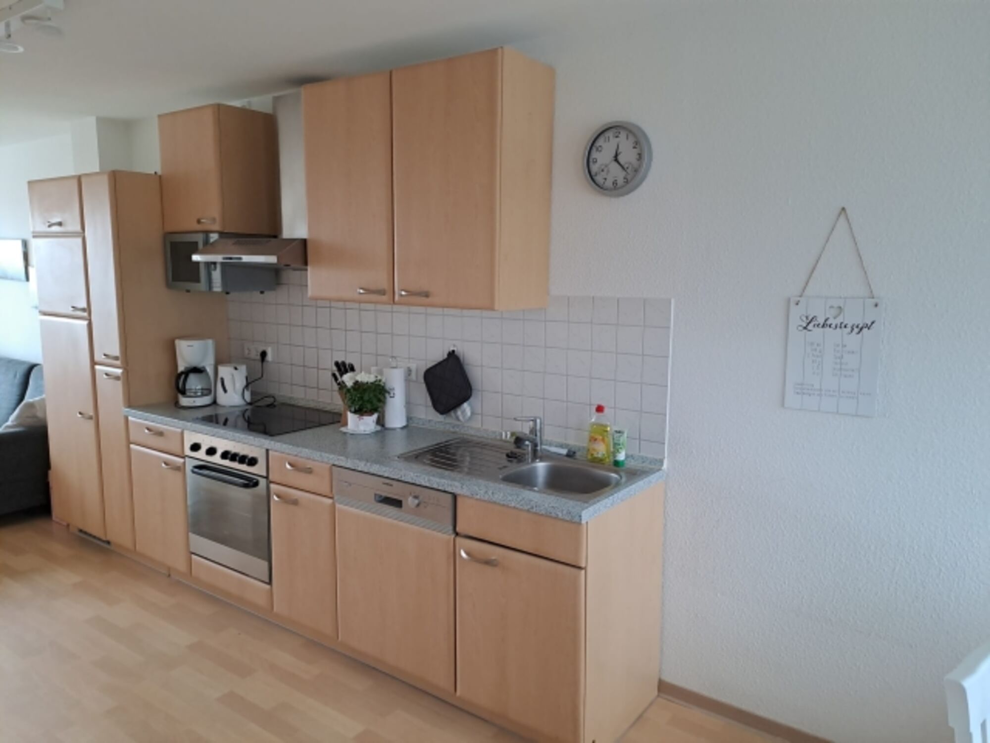 Cerankochfeld, Dunstabzugshaube, Kühlschrank mit Gefrierfach, Eierkocher, Korkenzieher / Flaschenöffner