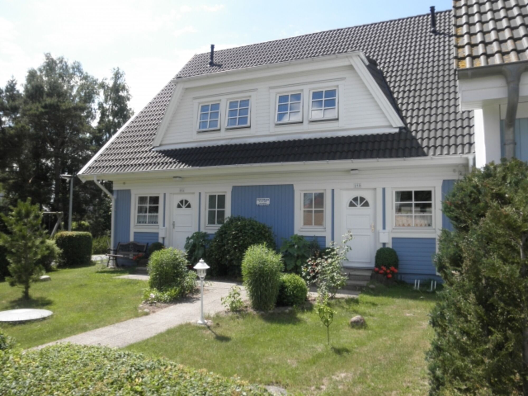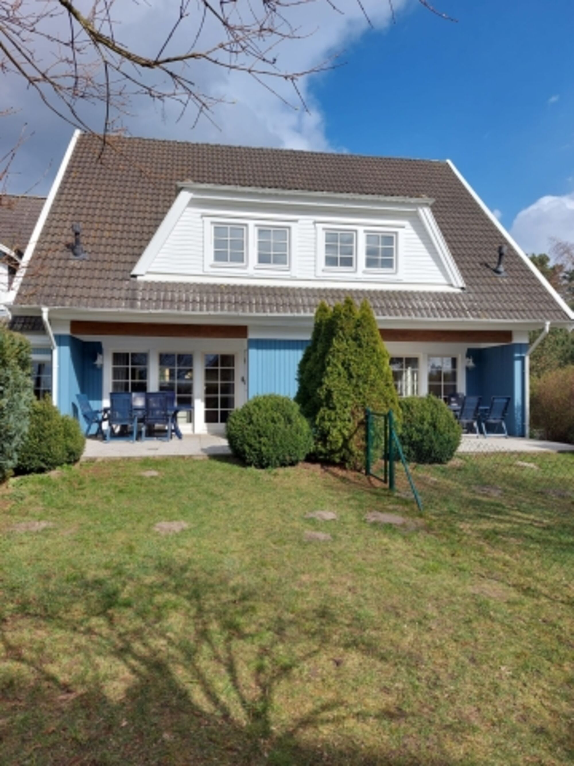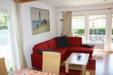 Sonniges Ferien-Doppelhaus mit 80 qm Wohnfläche und ca. 17 qm vollmöbilierter Terrase mit Grill und Garten mit Sonnenliegen. Das Ferienhaus verfügt über ein Schlafzimmer mit Doppelbett (hier gibt es die Möglichkeit ein Kinder-Reisebett zuzustellen) und ein Schlafzimmer mit Doppelbett und einem Einzelbett ( 1 Zusatzaufbettung ist möglich). Sie finden im Obergeschoss ein großes zusätzliches WC und ein Duschbad mit WC im Erdgeschoss.