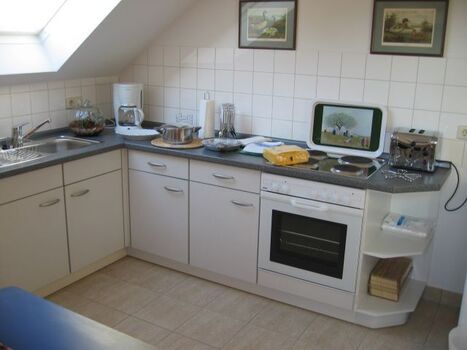 4-Platten Herd, Kühlschrank mit Gefrierfach, Eierkocher, Korkenzieher / Flaschenöffner, Geschirrhandtücher, Mülltüten, Essplatz in der Küche
