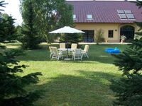 Die FEWO befindet sich als separate Wohnung (eigener Hauseingang/Hausflur/Treppenhaus) in einem großen Landhaus (Einfamilienhaus mit schallgeschützter Einliegerwohnung als FEWO/Seeseite/Südseite) auf einem parkänlichen Anwesen. Dort haben Sie im Süden Ihren eigenen, durch einen inneren Zaun (wegen unserer beiden Hunde) vom Rest des Grundstücks getrennten Gartenteil (ca. 2500 qm), an sich der schönste Teil des Grundstücks mit Sonne und (im Hochsommer) Schatten, altem Baumbestand, Gartenmöbeln, Sonnenschirm und Grillmöglichkeit. Unten am See steht Ihnen eine private große abschließbare Steganlage zur Verfügung, die durch das Schilf in den See hineinragt. Hier können Sie baden, sich sonnen, angeln oder Ihr Boot festmachen. In der Nähe der Steganlage ist eine Hundebadestelle des Nachbarn, die Sie auch benutzen können.